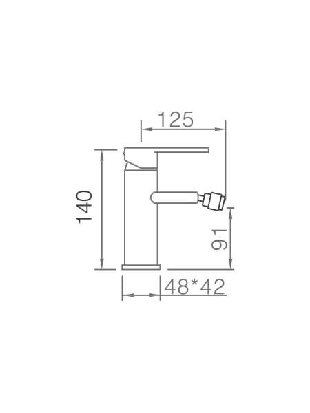 El grifo monomando Alicante de bidé tiene una altura de 140 mm y un largo de 125 mm, con una altura del caño a la base del grifo de 90 mm.