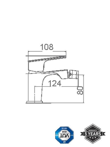 El grifo monomando Liria de bidé tiene una altura de 134 mm y un largo de 108mm, con una altura del caño a la base del grifo de 98 mm.