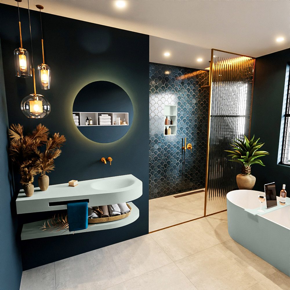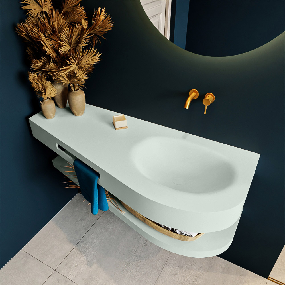 Esta serie no solo se ve hermosa en una lujosa habitación de hotel, sino que también puede ser un llamativo fantástico en su baño. La forma especial del lavabo DULCET y el soporte integrado para toallas aseguran que incluso en baños más pequeños, puedas disfrutar de este elegante estilo de hotel. El mueble de baño en esta imagen es el mueble de baño RIVA con repisa. La repisa de superficie sólida tiene la misma forma cónica que el lavabo y te proporciona espacio para mostrar productos de baño hermosos.