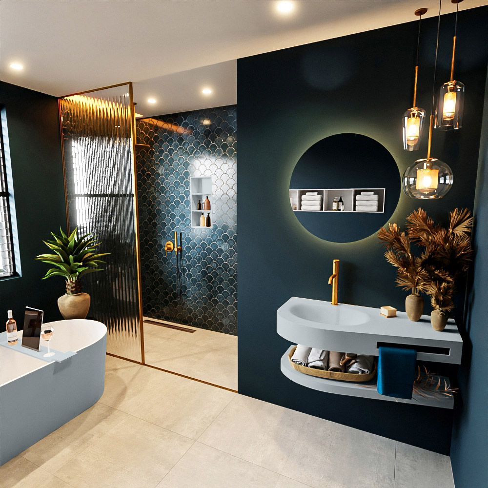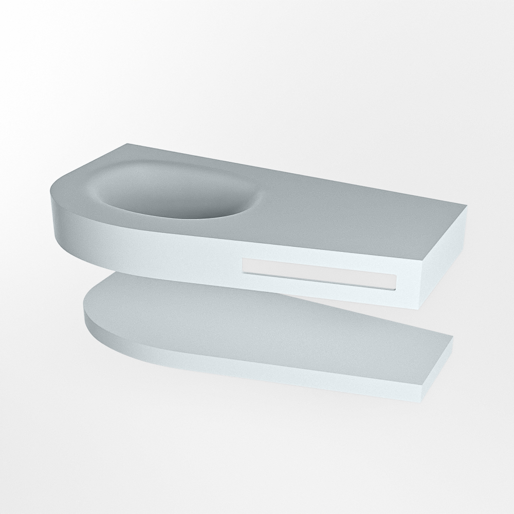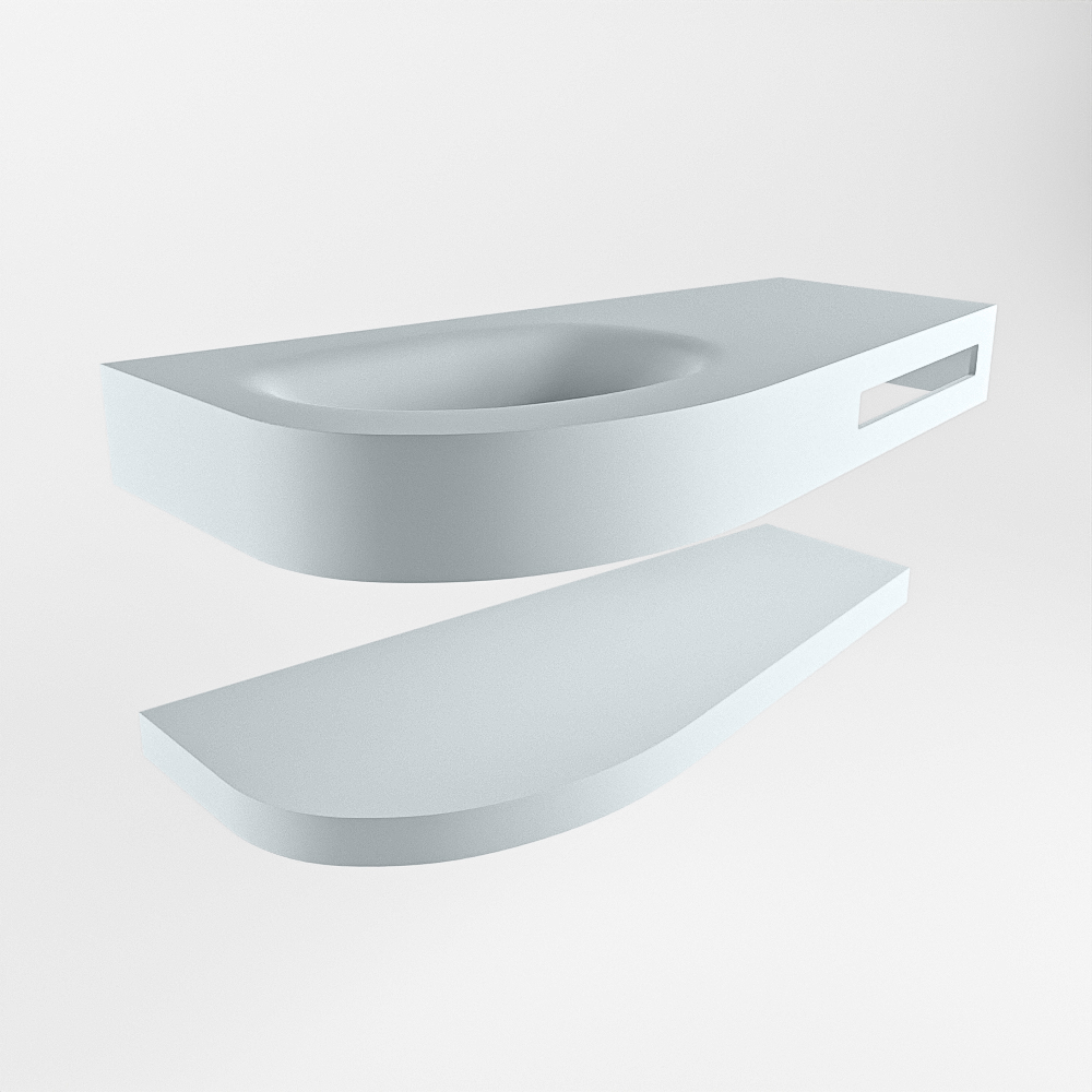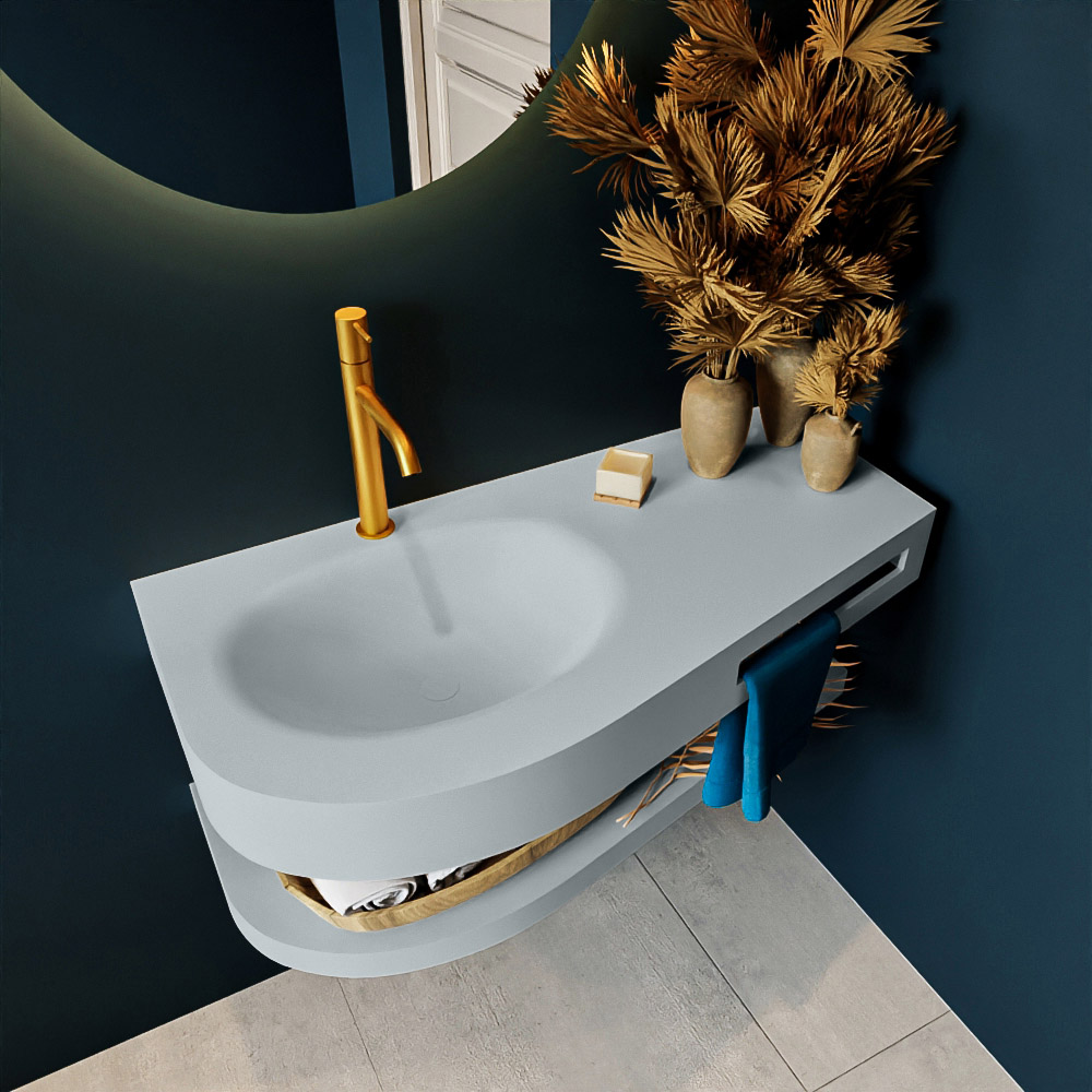 Esta serie no solo se ve hermosa en una lujosa habitación de hotel, sino que también puede ser un llamativo fantástico en su baño. La forma especial del lavabo DULCET y el soporte integrado para toallas aseguran que incluso en baños más pequeños, puedas disfrutar de este elegante estilo de hotel. El mueble de baño en esta imagen es el mueble de baño RIVA con repisa. La repisa de superficie sólida tiene la misma forma cónica que el lavabo y te proporciona espacio para mostrar productos de baño hermosos.