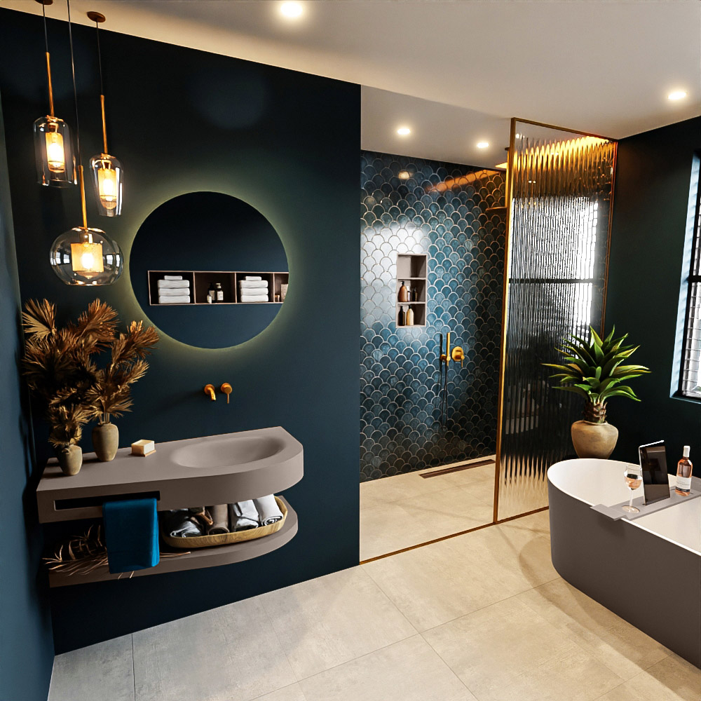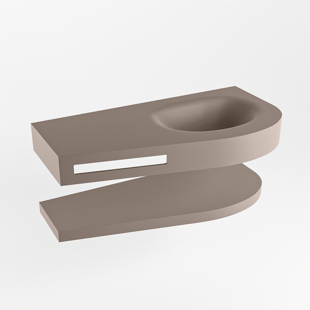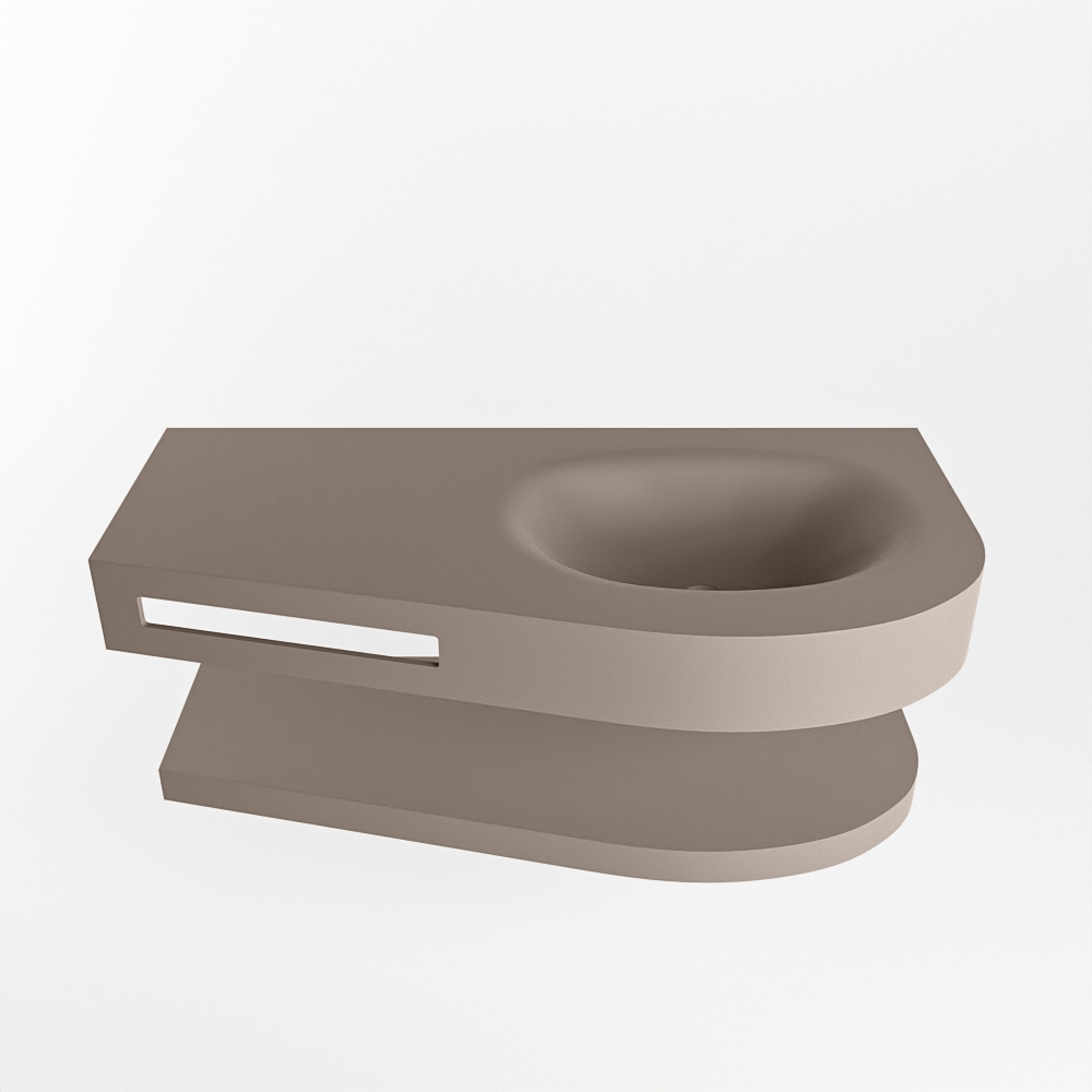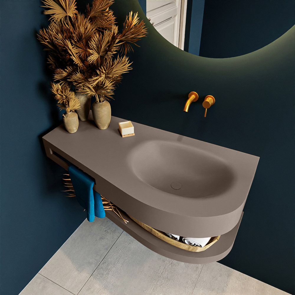 Esta serie no solo se ve hermosa en una lujosa habitación de hotel, sino que también puede ser un llamativo fantástico en su baño. La forma especial del lavabo DULCET y el soporte integrado para toallas aseguran que incluso en baños más pequeños, puedas disfrutar de este elegante estilo de hotel. El mueble de baño en esta imagen es el mueble de baño RIVA con repisa. La repisa de superficie sólida tiene la misma forma cónica que el lavabo y te proporciona espacio para mostrar productos de baño hermosos.