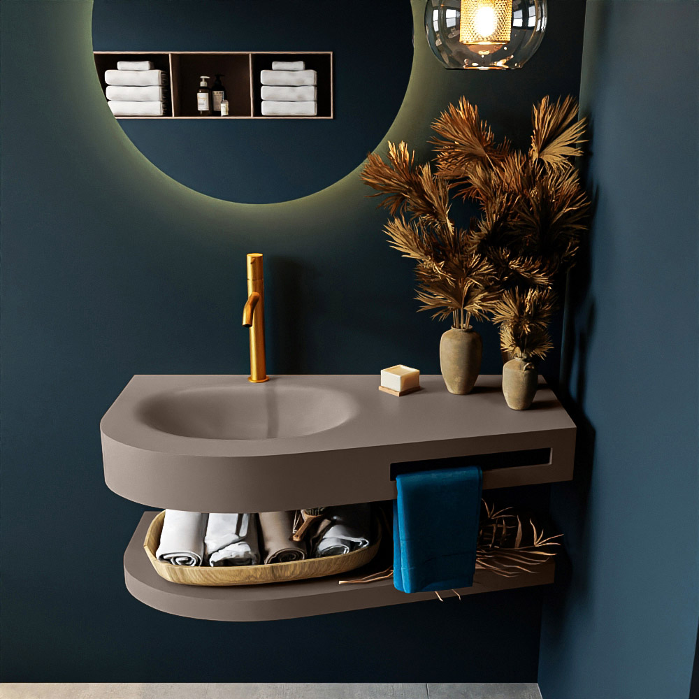 Esta serie no solo se ve hermosa en una lujosa habitación de hotel, sino que también puede ser un llamativo fantástico en su baño. La forma especial del lavabo DULCET y el soporte integrado para toallas aseguran que incluso en baños más pequeños, puedas disfrutar de este elegante estilo de hotel. El mueble de baño en esta imagen es el mueble de baño RIVA con repisa. La repisa de superficie sólida tiene la misma forma cónica que el lavabo y te proporciona espacio para mostrar productos de baño hermosos.