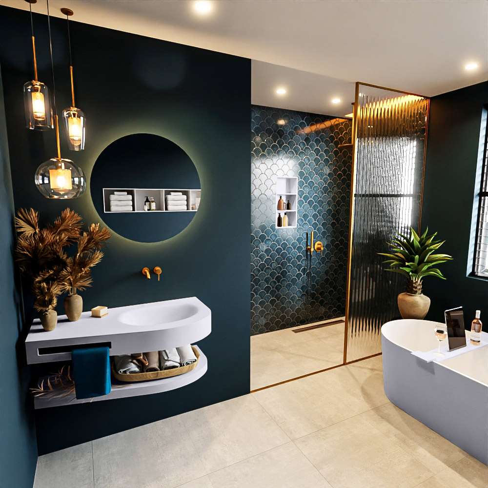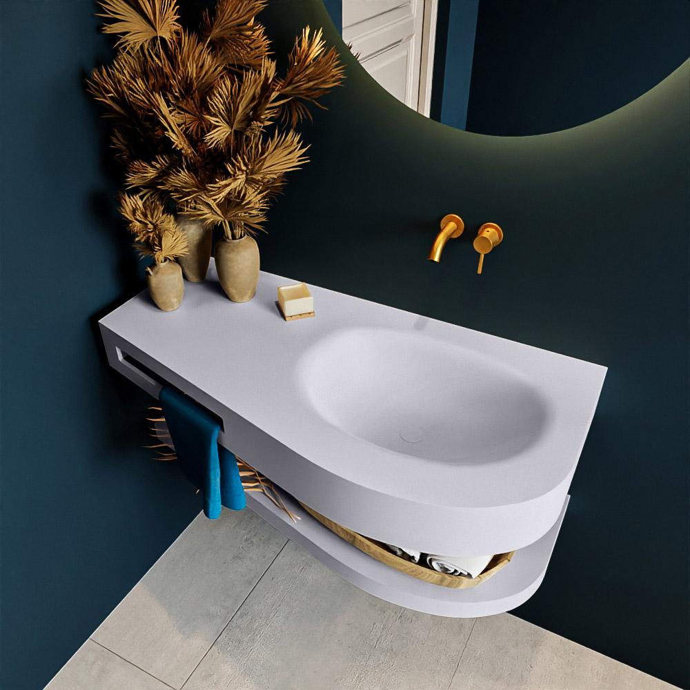 Esta serie no solo se ve hermosa en una lujosa habitación de hotel, sino que también puede ser un llamativo fantástico en su baño. La forma especial del lavabo DULCET y el soporte integrado para toallas aseguran que incluso en baños más pequeños, puedas disfrutar de este elegante estilo de hotel. El mueble de baño en esta imagen es el mueble de baño RIVA con repisa. La repisa de superficie sólida tiene la misma forma cónica que el lavabo y te proporciona espacio para mostrar productos de baño hermosos.