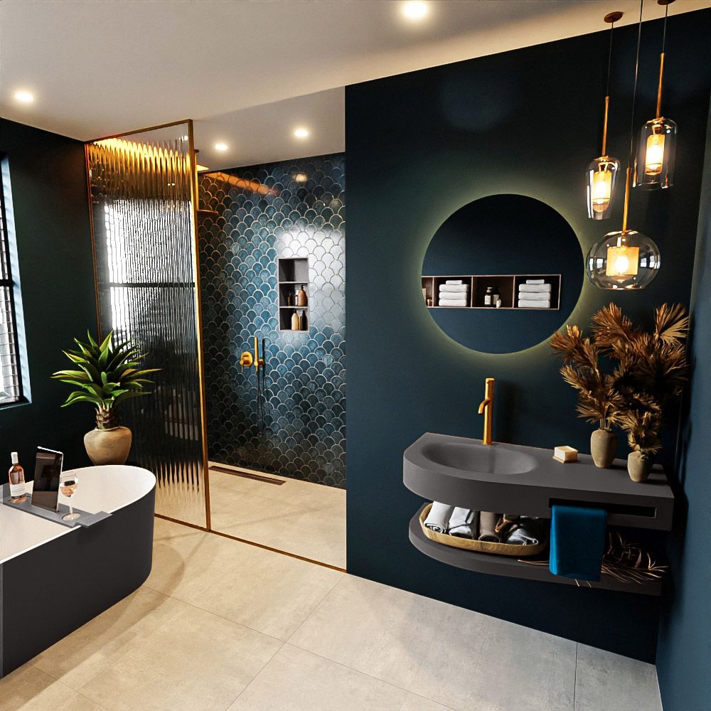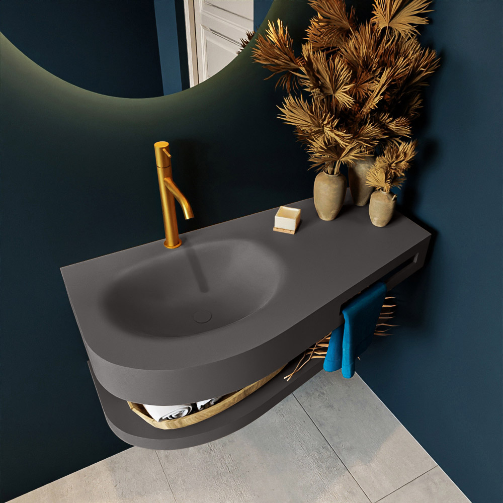Esta serie no solo se ve hermosa en una lujosa habitación de hotel, sino que también puede ser un llamativo fantástico en su baño. La forma especial del lavabo DULCET y el soporte integrado para toallas aseguran que incluso en baños más pequeños, puedas disfrutar de este elegante estilo de hotel. El mueble de baño en esta imagen es el mueble de baño RIVA con repisa. La repisa de superficie sólida tiene la misma forma cónica que el lavabo y te proporciona espacio para mostrar productos de baño hermosos.