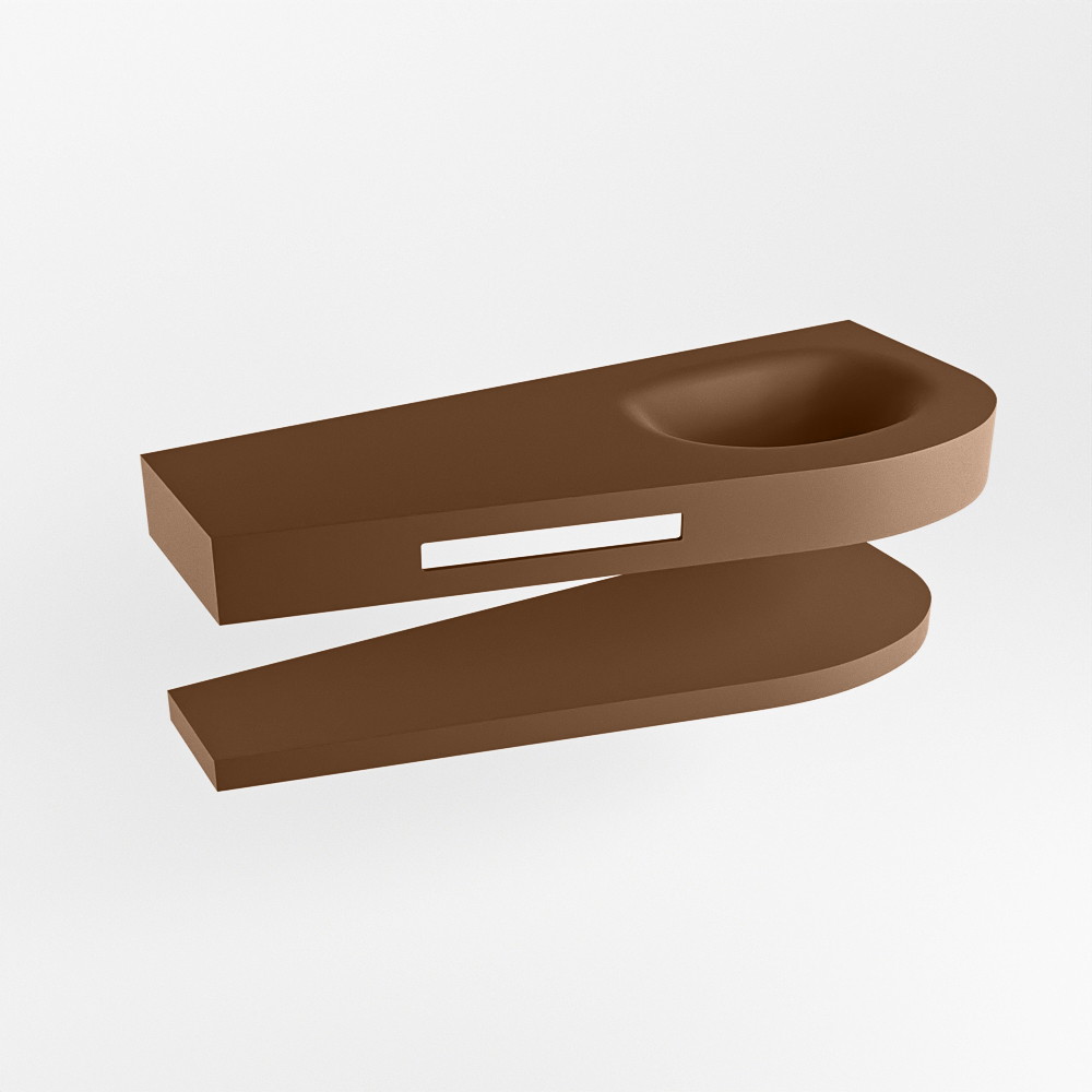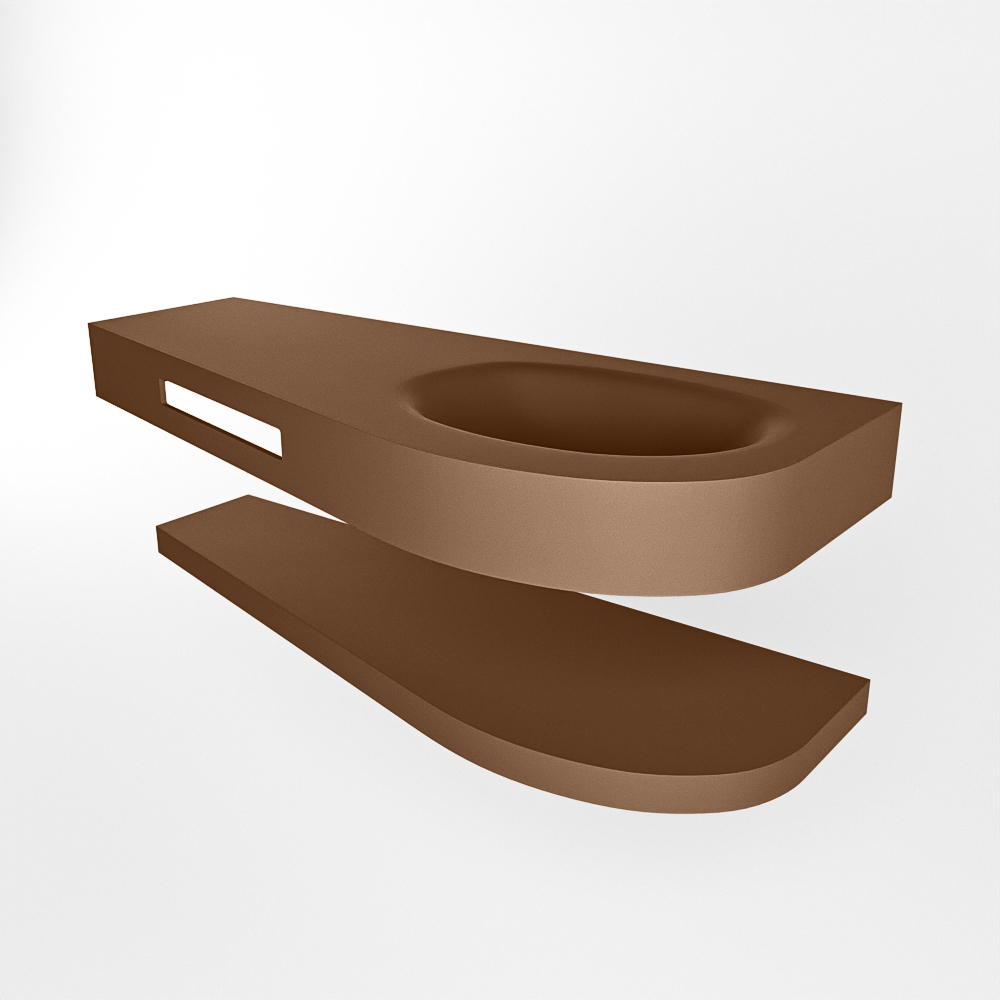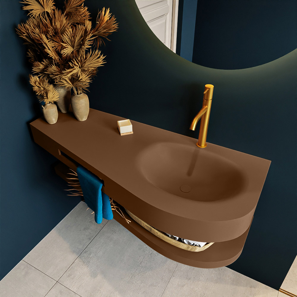 Esta serie no solo se ve hermosa en una lujosa habitación de hotel, sino que también puede ser un llamativo fantástico en su baño. La forma especial del lavabo DULCET y el soporte integrado para toallas aseguran que incluso en baños más pequeños, puedas disfrutar de este elegante estilo de hotel. El mueble de baño en esta imagen es el mueble de baño RIVA con repisa. La repisa de superficie sólida tiene la misma forma cónica que el lavabo y te proporciona espacio para mostrar productos de baño hermosos.