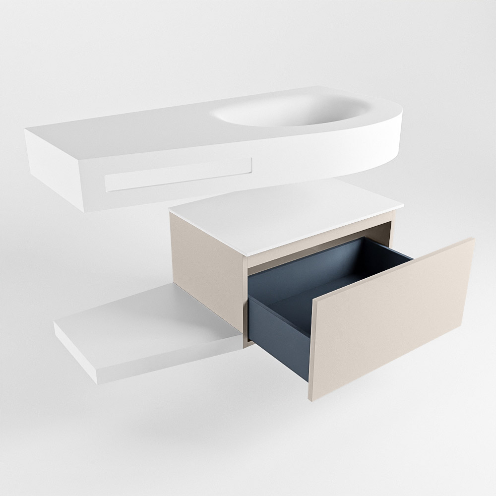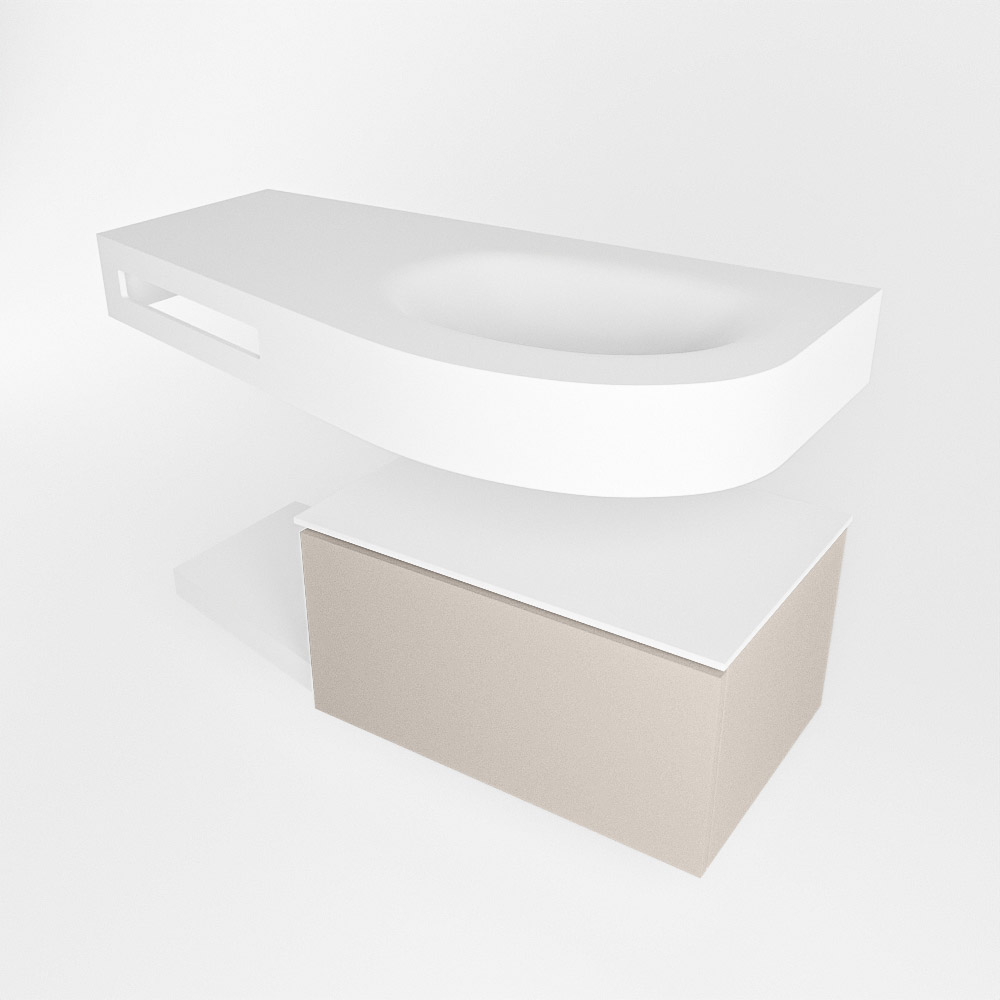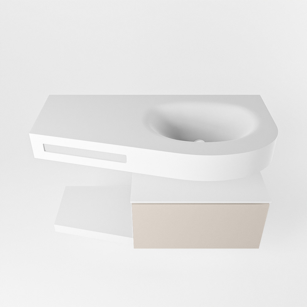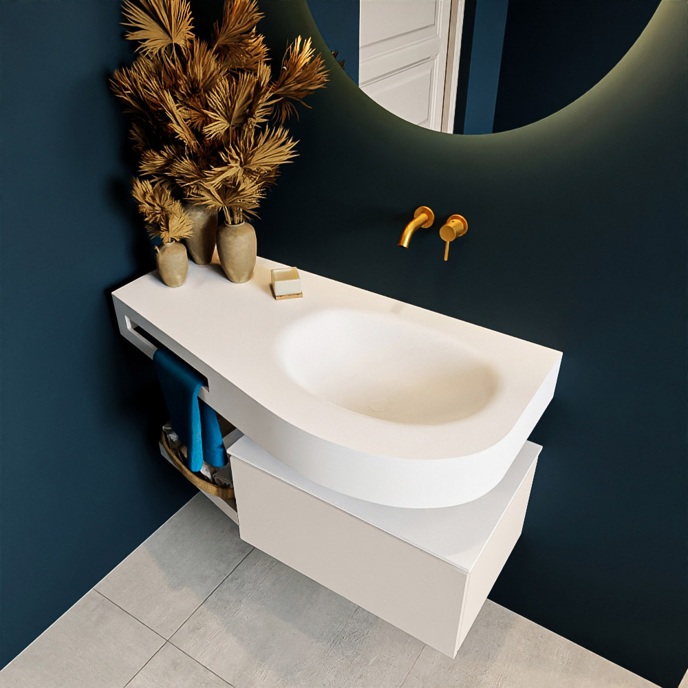 Esta colección no solo se ve hermosa en una lujosa habitación de hotel, sino que también puede ser una pieza central fantástica en su baño. La forma especial del lavabo DULCET y el soporte integrado para toallas aseguran que incluso en baños más pequeños puedas disfrutar de esta elegancia de hotel. El mueble de baño en estas imágenes es el mueble de baño RIVA con un gabinete inferior. El RIVA tiene un gabinete inferior suspendido con 1 cajón, en el que hay espacio suficiente para sus artículos de baño. El estante de superficie sólida tiene la misma forma cónica que el lavabo. El estante le brinda espacio para mostrar hermosos productos de baño.