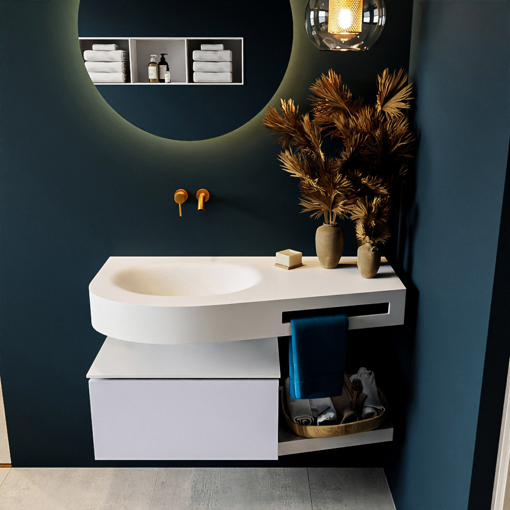 Esta colección no solo se ve hermosa en una lujosa habitación de hotel, sino que también puede ser una pieza central fantástica en su baño. La forma especial del lavabo DULCET y el soporte integrado para toallas aseguran que incluso en baños más pequeños puedas disfrutar de esta elegancia de hotel. El mueble de baño en estas imágenes es el mueble de baño RIVA con un gabinete inferior. El RIVA tiene un gabinete inferior suspendido con 1 cajón, en el que hay espacio suficiente para sus artículos de baño. El estante de superficie sólida tiene la misma forma cónica que el lavabo. El estante le brinda espacio para mostrar hermosos productos de baño.