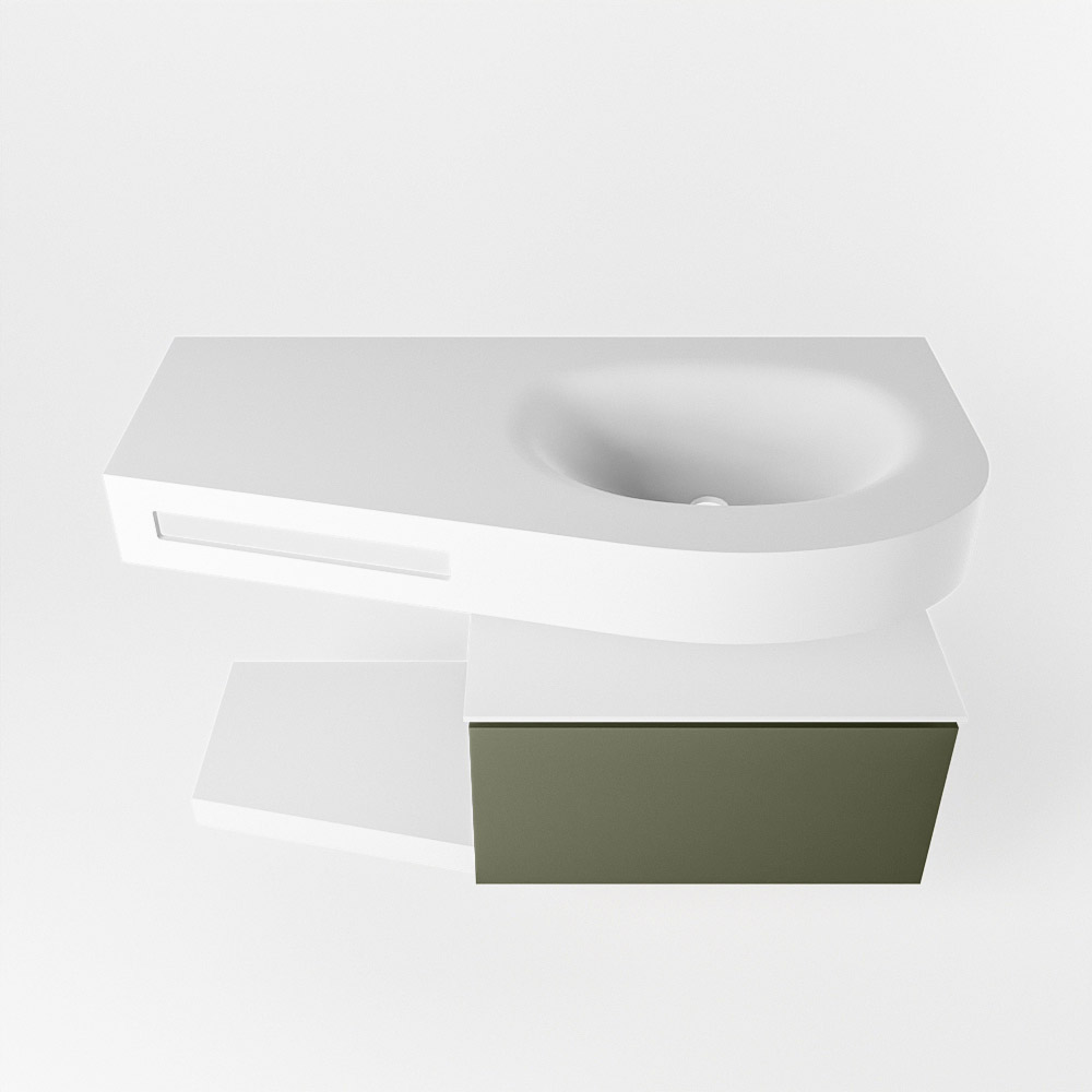 Esta colección no solo se ve hermosa en una lujosa habitación de hotel, sino que también puede ser una pieza central fantástica en su baño. La forma especial del lavabo DULCET y el soporte integrado para toallas aseguran que incluso en baños más pequeños puedas disfrutar de esta elegancia de hotel. El mueble de baño en estas imágenes es el mueble de baño RIVA con un gabinete inferior. El RIVA tiene un gabinete inferior suspendido con 1 cajón, en el que hay espacio suficiente para sus artículos de baño. El estante de superficie sólida tiene la misma forma cónica que el lavabo. El estante le brinda espacio para mostrar hermosos productos de baño.
