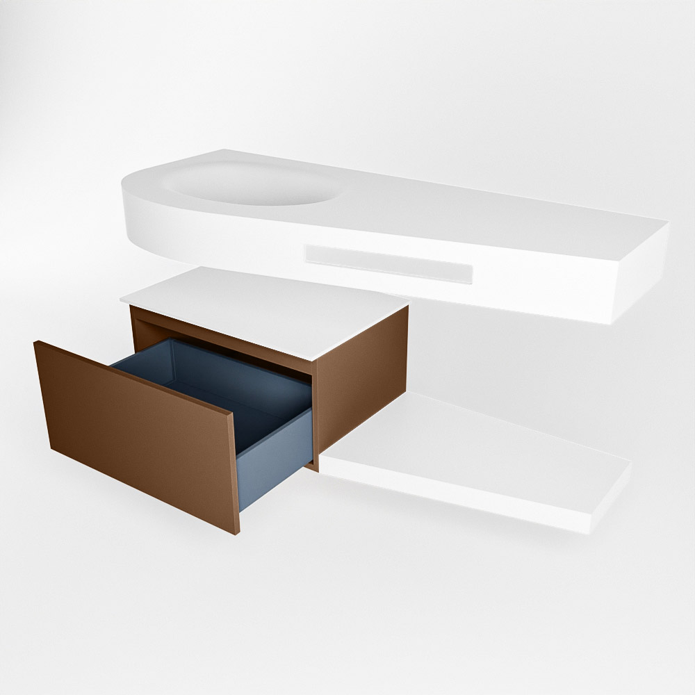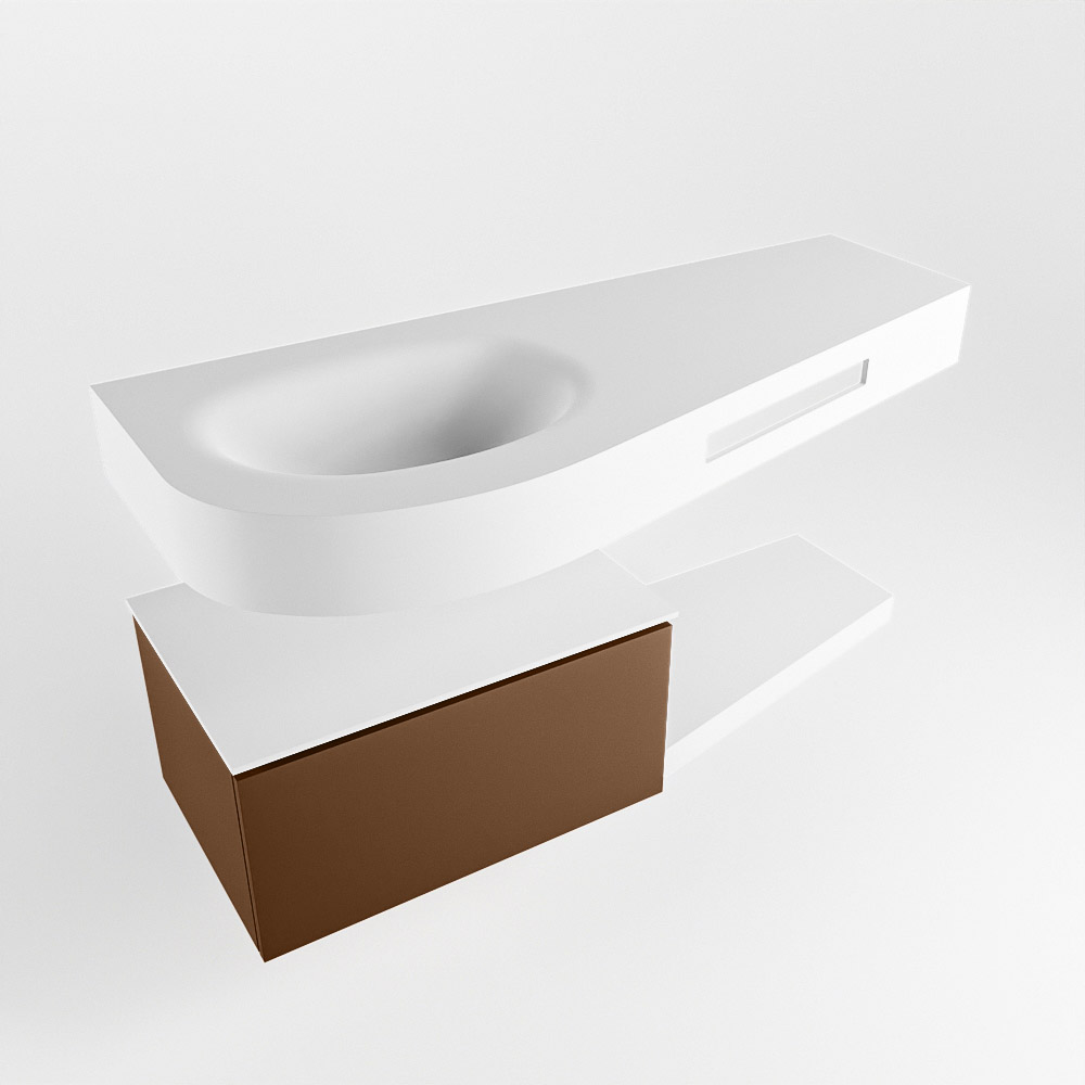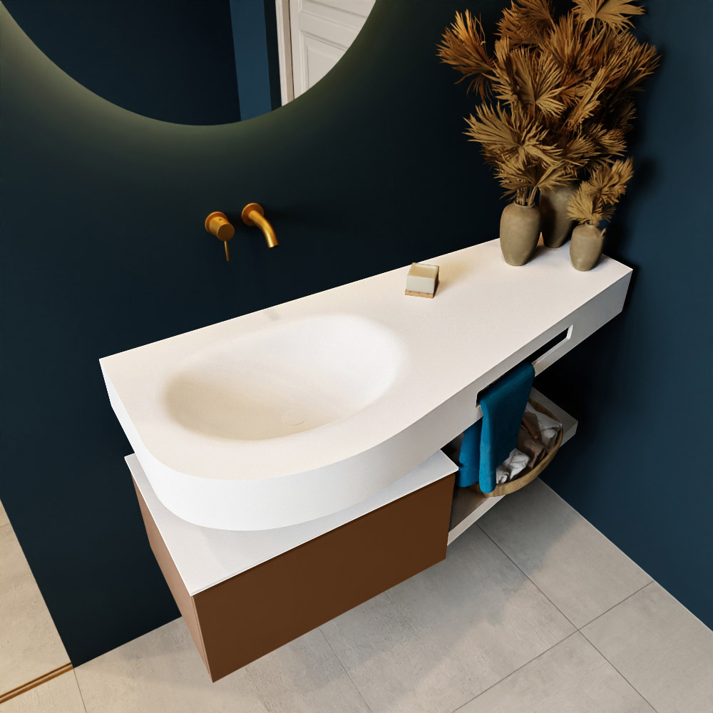 Esta colección no solo se ve hermosa en una lujosa habitación de hotel, sino que también puede ser una pieza central fantástica en su baño. La forma especial del lavabo DULCET y el soporte integrado para toallas aseguran que incluso en baños más pequeños puedas disfrutar de esta elegancia de hotel. El mueble de baño en estas imágenes es el mueble de baño RIVA con un gabinete inferior. El RIVA tiene un gabinete inferior suspendido con 1 cajón, en el que hay espacio suficiente para sus artículos de baño. El estante de superficie sólida tiene la misma forma cónica que el lavabo. El estante le brinda espacio para mostrar hermosos productos de baño.