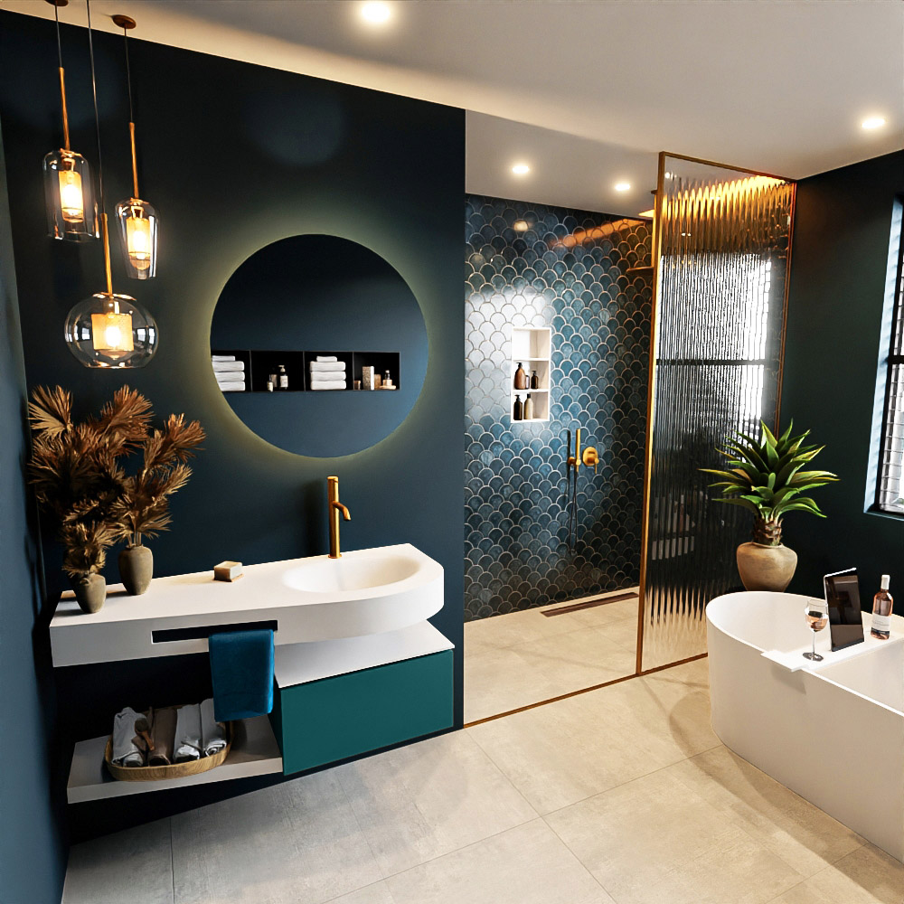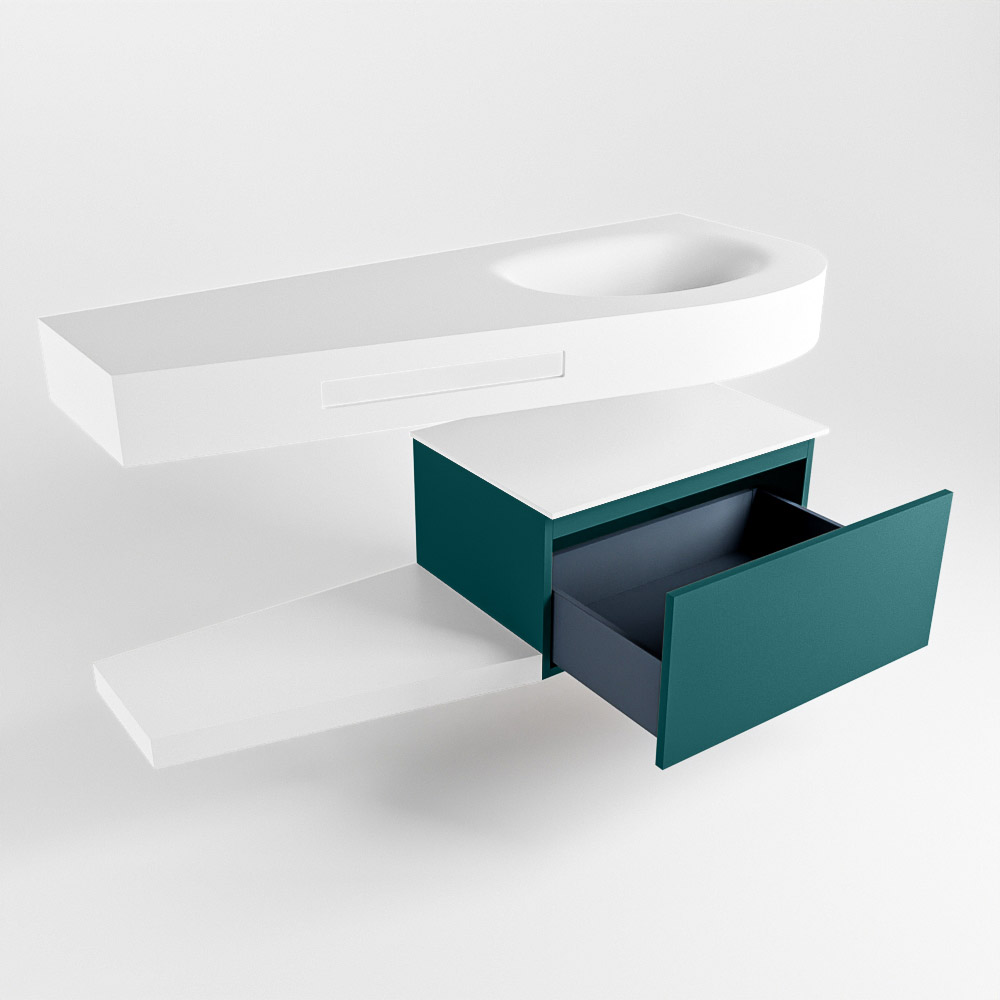 Esta colección no solo se ve hermosa en una lujosa habitación de hotel, sino que también puede ser una pieza central fantástica en su baño. La forma especial del lavabo DULCET y el soporte integrado para toallas aseguran que incluso en baños más pequeños puedas disfrutar de esta elegancia de hotel. El mueble de baño en estas imágenes es el mueble de baño RIVA con un gabinete inferior. El RIVA tiene un gabinete inferior suspendido con 1 cajón, en el que hay espacio suficiente para sus artículos de baño. El estante de superficie sólida tiene la misma forma cónica que el lavabo. El estante le brinda espacio para mostrar hermosos productos de baño.
