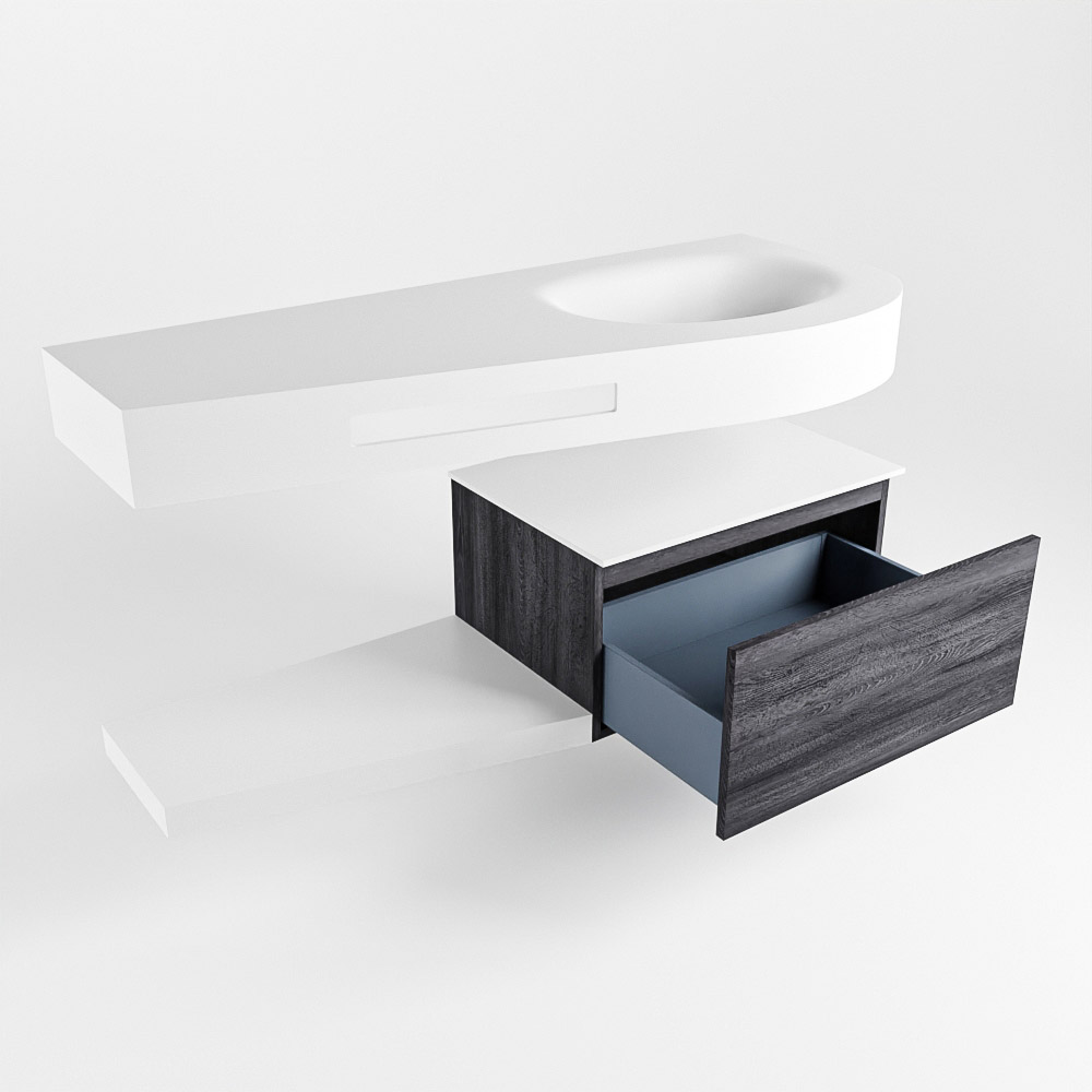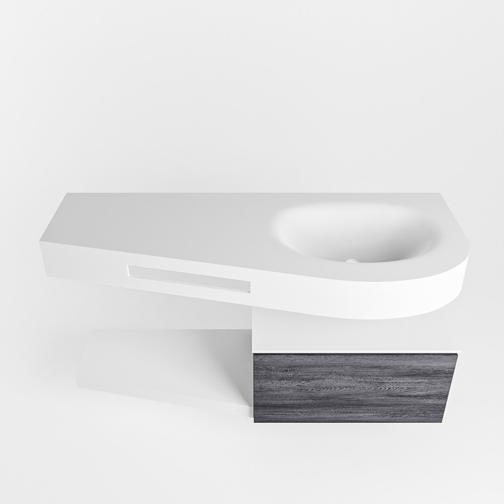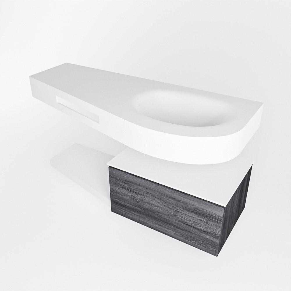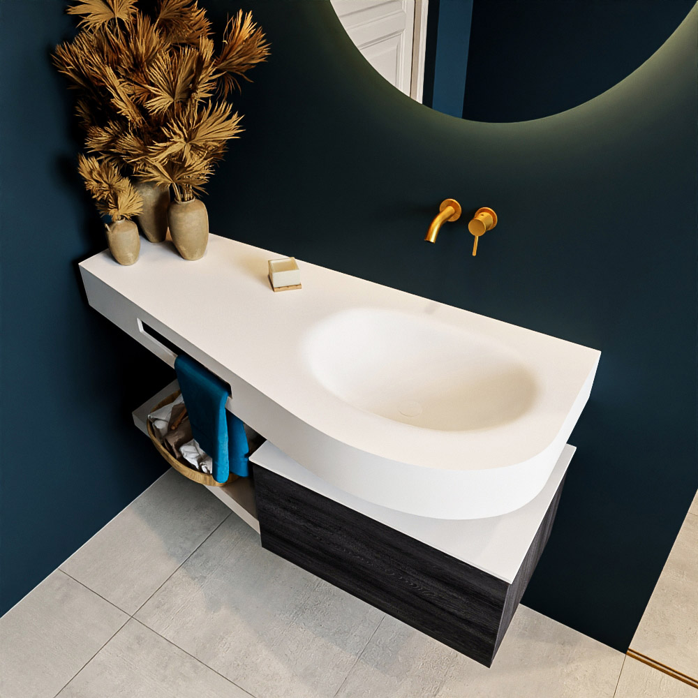 Esta colección no solo se ve hermosa en una lujosa habitación de hotel, sino que también puede ser una pieza central fantástica en su baño. La forma especial del lavabo DULCET y el soporte integrado para toallas aseguran que incluso en baños más pequeños puedas disfrutar de esta elegancia de hotel. El mueble de baño en estas imágenes es el mueble de baño RIVA con un gabinete inferior. El RIVA tiene un gabinete inferior suspendido con 1 cajón, en el que hay espacio suficiente para sus artículos de baño. El estante de superficie sólida tiene la misma forma cónica que el lavabo. El estante le brinda espacio para mostrar hermosos productos de baño.