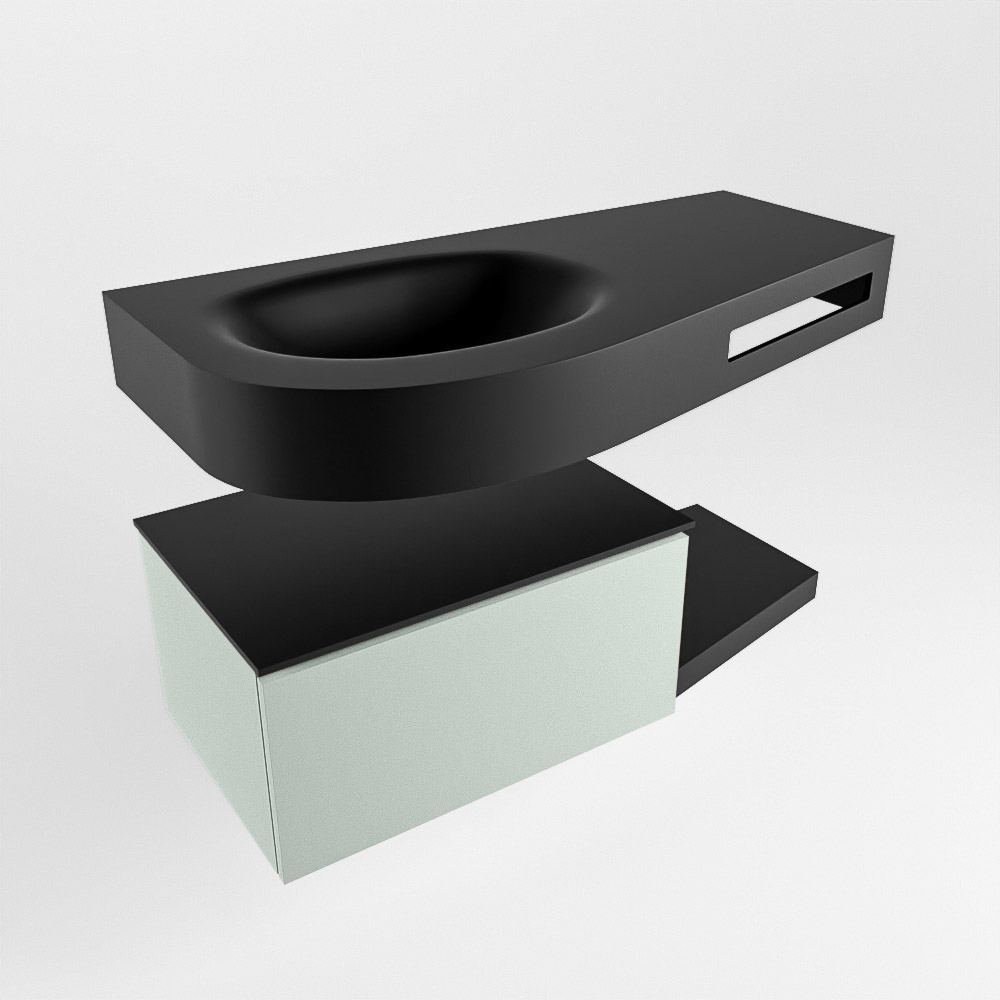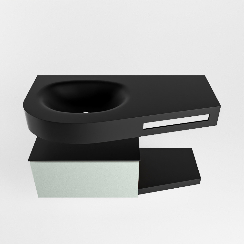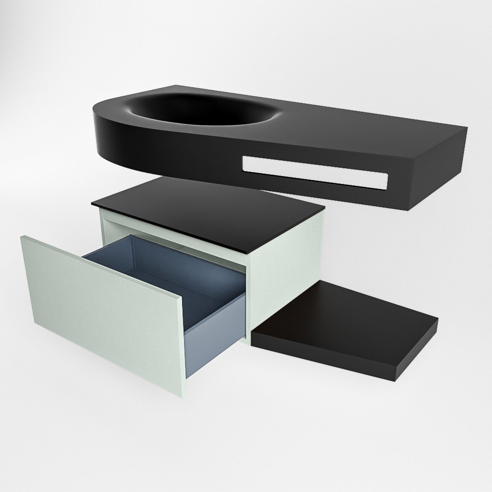Esta colección no solo se ve hermosa en una lujosa habitación de hotel, sino que también puede ser una pieza central fantástica en su baño. La forma especial del lavabo DULCET y el soporte integrado para toallas aseguran que incluso en baños más pequeños puedas disfrutar de esta elegancia de hotel. El mueble de baño en estas imágenes es el mueble de baño RIVA con un gabinete inferior. El RIVA tiene un gabinete inferior suspendido con 1 cajón, en el que hay espacio suficiente para sus artículos de baño. El estante de superficie sólida tiene la misma forma cónica que el lavabo. El estante le brinda espacio para mostrar hermosos productos de baño.