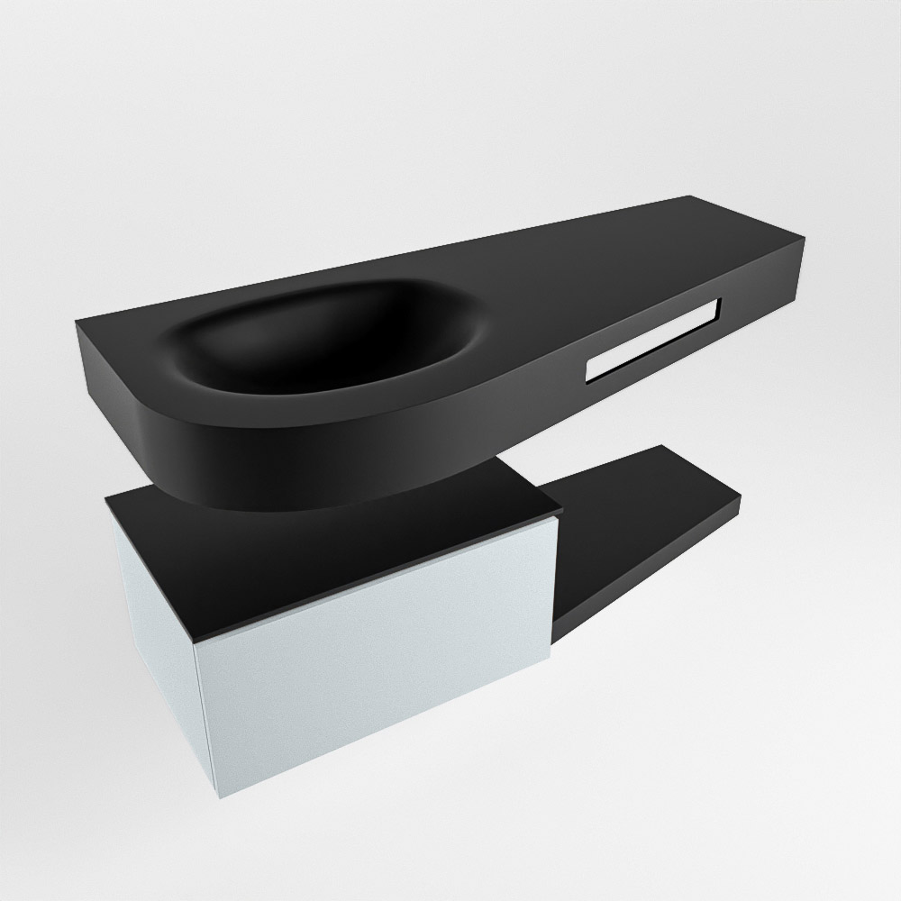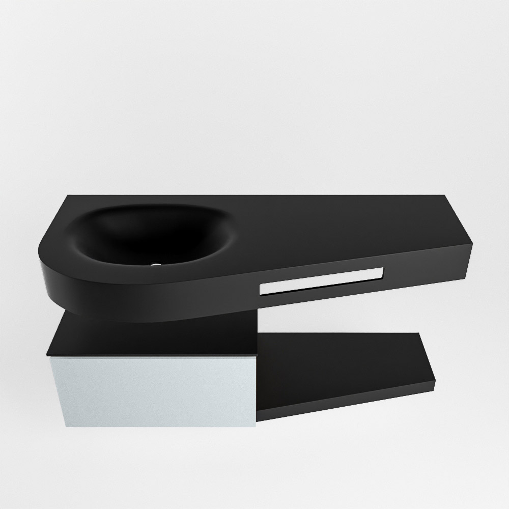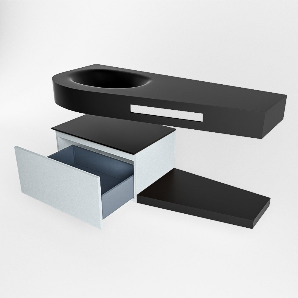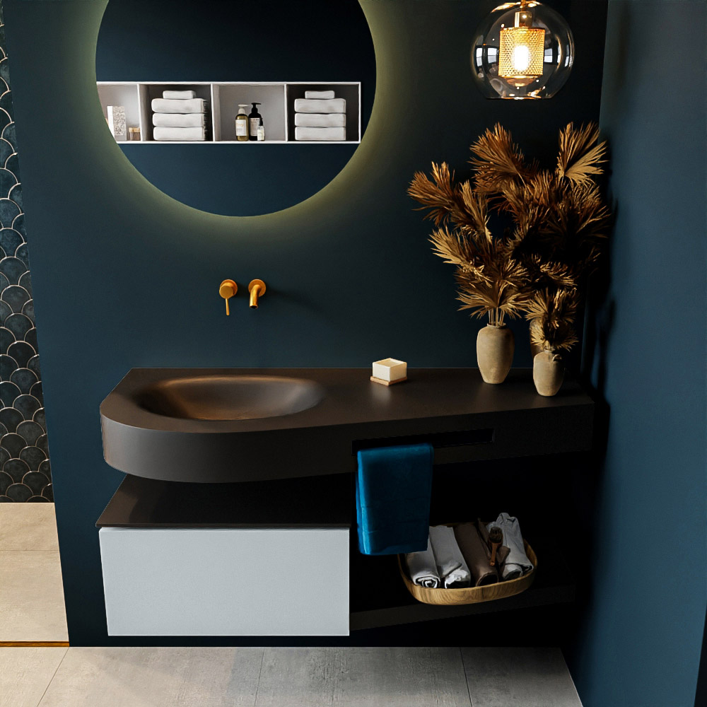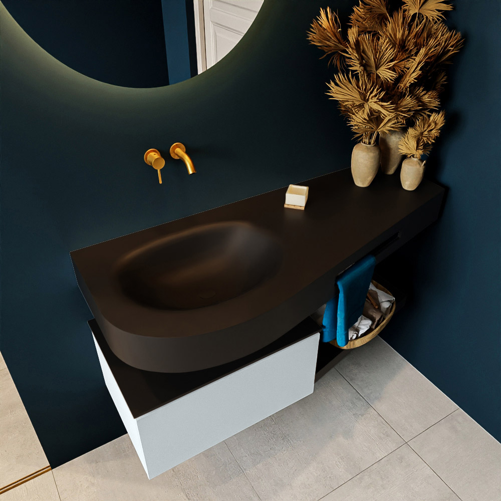Esta colección no solo se ve hermosa en una lujosa habitación de hotel, sino que también puede ser una pieza central fantástica en su baño. La forma especial del lavabo DULCET y el soporte integrado para toallas aseguran que incluso en baños más pequeños puedas disfrutar de esta elegancia de hotel. El mueble de baño en estas imágenes es el mueble de baño RIVA con un gabinete inferior. El RIVA tiene un gabinete inferior suspendido con 1 cajón, en el que hay espacio suficiente para sus artículos de baño. El estante de superficie sólida tiene la misma forma cónica que el lavabo. El estante le brinda espacio para mostrar hermosos productos de baño.