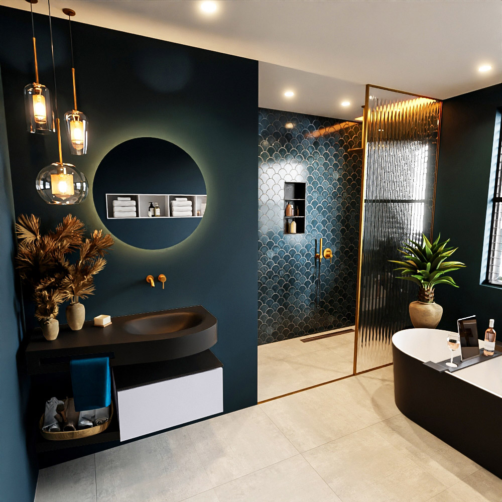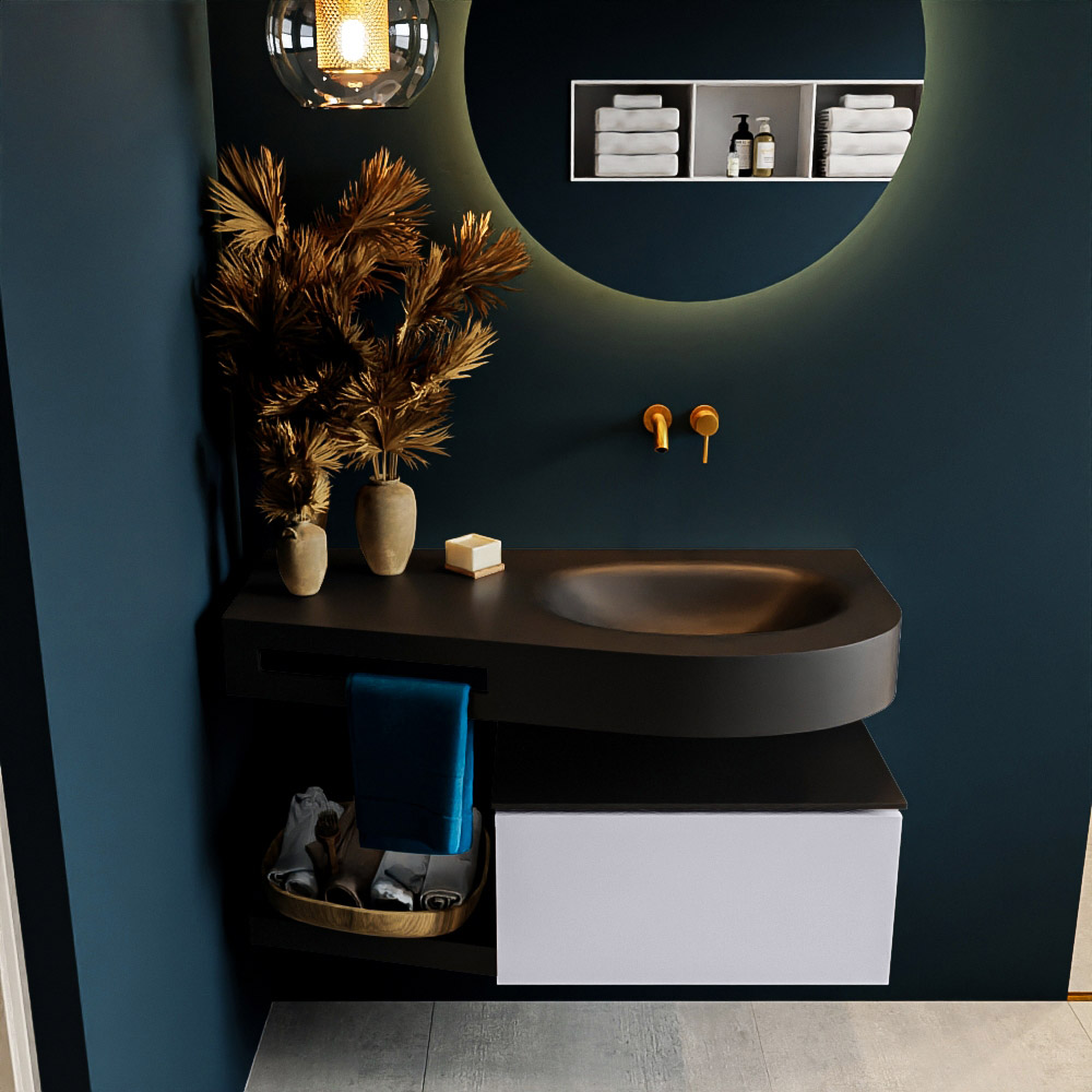 Esta colección no solo se ve hermosa en una lujosa habitación de hotel, sino que también puede ser una pieza central fantástica en su baño. La forma especial del lavabo DULCET y el soporte integrado para toallas aseguran que incluso en baños más pequeños puedas disfrutar de esta elegancia de hotel. El mueble de baño en estas imágenes es el mueble de baño RIVA con un gabinete inferior. El RIVA tiene un gabinete inferior suspendido con 1 cajón, en el que hay espacio suficiente para sus artículos de baño. El estante de superficie sólida tiene la misma forma cónica que el lavabo. El estante le brinda espacio para mostrar hermosos productos de baño.