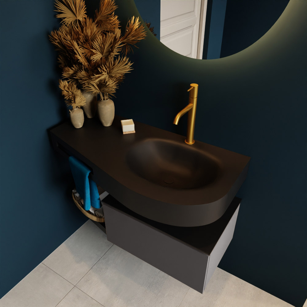 Esta colección no solo se ve hermosa en una lujosa habitación de hotel, sino que también puede ser una pieza central fantástica en su baño. La forma especial del lavabo DULCET y el soporte integrado para toallas aseguran que incluso en baños más pequeños puedas disfrutar de esta elegancia de hotel. El mueble de baño en estas imágenes es el mueble de baño RIVA con un gabinete inferior. El RIVA tiene un gabinete inferior suspendido con 1 cajón, en el que hay espacio suficiente para sus artículos de baño. El estante de superficie sólida tiene la misma forma cónica que el lavabo. El estante le brinda espacio para mostrar hermosos productos de baño.