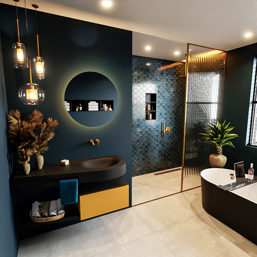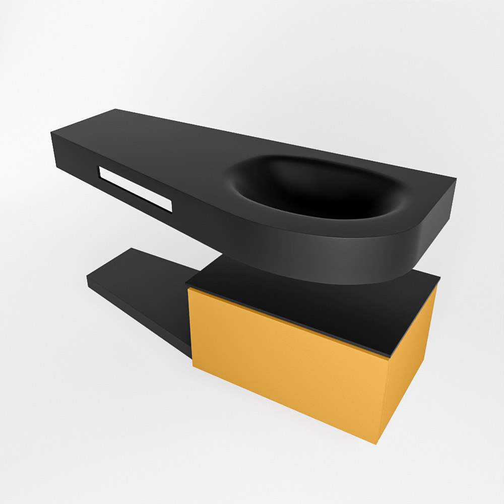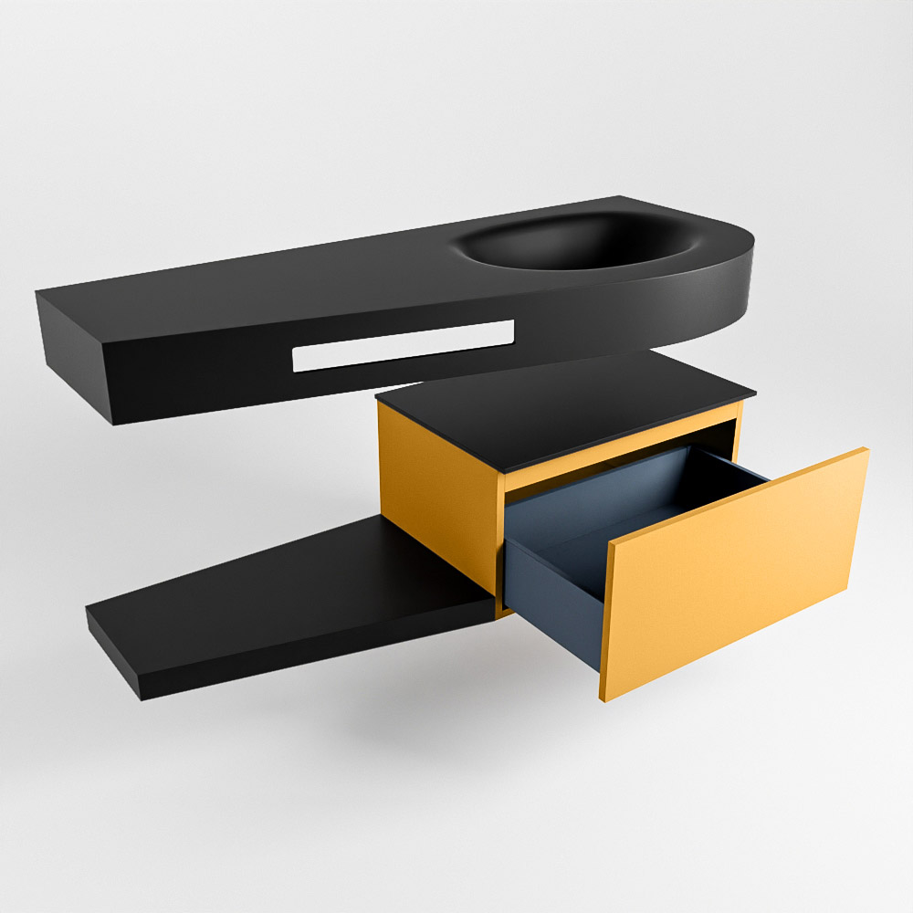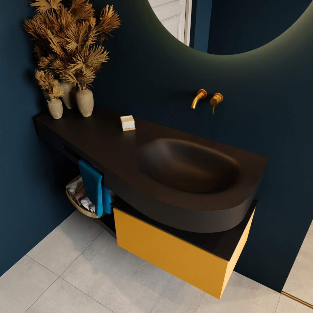 Esta colección no solo se ve hermosa en una lujosa habitación de hotel, sino que también puede ser una pieza central fantástica en su baño. La forma especial del lavabo DULCET y el soporte integrado para toallas aseguran que incluso en baños más pequeños puedas disfrutar de esta elegancia de hotel. El mueble de baño en estas imágenes es el mueble de baño RIVA con un gabinete inferior. El RIVA tiene un gabinete inferior suspendido con 1 cajón, en el que hay espacio suficiente para sus artículos de baño. El estante de superficie sólida tiene la misma forma cónica que el lavabo. El estante le brinda espacio para mostrar hermosos productos de baño.