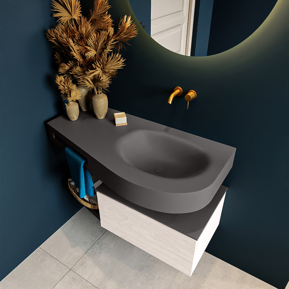 Esta colección no solo se ve hermosa en una lujosa habitación de hotel, sino que también puede ser una pieza central fantástica en su baño. La forma especial del lavabo DULCET y el soporte integrado para toallas aseguran que incluso en baños más pequeños puedas disfrutar de esta elegancia de hotel. El mueble de baño en estas imágenes es el mueble de baño RIVA con un gabinete inferior. El RIVA tiene un gabinete inferior suspendido con 1 cajón, en el que hay espacio suficiente para sus artículos de baño. El estante de superficie sólida tiene la misma forma cónica que el lavabo. El estante le brinda espacio para mostrar hermosos productos de baño.