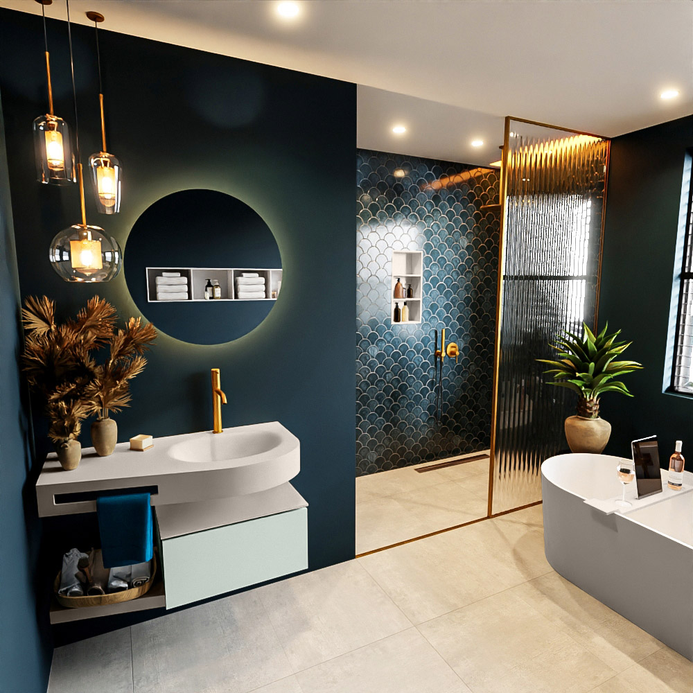 Esta colección no solo se ve hermosa en una lujosa habitación de hotel, sino que también puede ser una pieza central fantástica en su baño. La forma especial del lavabo DULCET y el soporte integrado para toallas aseguran que incluso en baños más pequeños puedas disfrutar de esta elegancia de hotel. El mueble de baño en estas imágenes es el mueble de baño RIVA con un gabinete inferior. El RIVA tiene un gabinete inferior suspendido con 1 cajón, en el que hay espacio suficiente para sus artículos de baño. El estante de superficie sólida tiene la misma forma cónica que el lavabo. El estante le brinda espacio para mostrar hermosos productos de baño.