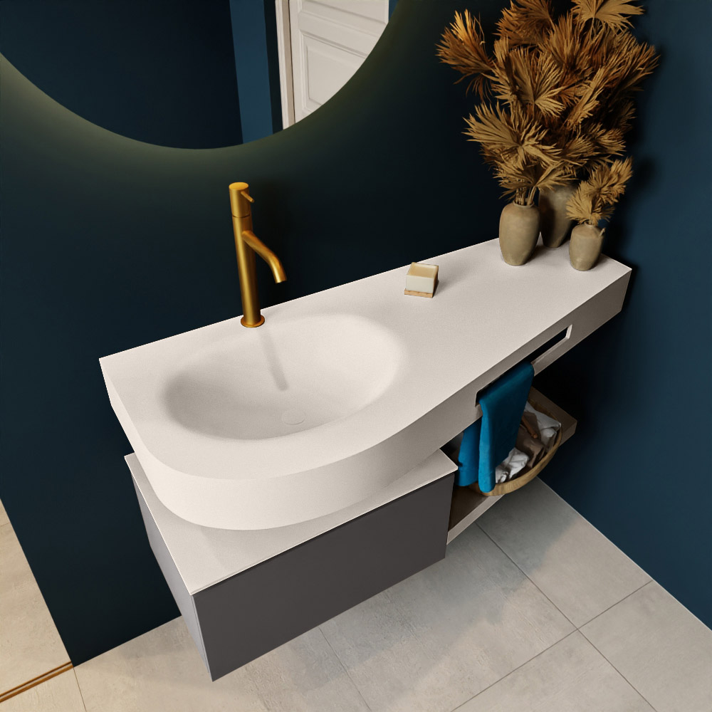 Esta colección no solo se ve hermosa en una lujosa habitación de hotel, sino que también puede ser una pieza central fantástica en su baño. La forma especial del lavabo DULCET y el soporte integrado para toallas aseguran que incluso en baños más pequeños puedas disfrutar de esta elegancia de hotel. El mueble de baño en estas imágenes es el mueble de baño RIVA con un gabinete inferior. El RIVA tiene un gabinete inferior suspendido con 1 cajón, en el que hay espacio suficiente para sus artículos de baño. El estante de superficie sólida tiene la misma forma cónica que el lavabo. El estante le brinda espacio para mostrar hermosos productos de baño.