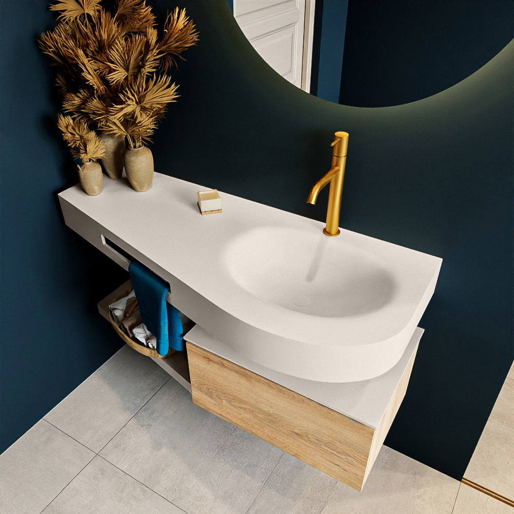 Esta colección no solo se ve hermosa en una lujosa habitación de hotel, sino que también puede ser una pieza central fantástica en su baño. La forma especial del lavabo DULCET y el soporte integrado para toallas aseguran que incluso en baños más pequeños puedas disfrutar de esta elegancia de hotel. El mueble de baño en estas imágenes es el mueble de baño RIVA con un gabinete inferior. El RIVA tiene un gabinete inferior suspendido con 1 cajón, en el que hay espacio suficiente para sus artículos de baño. El estante de superficie sólida tiene la misma forma cónica que el lavabo. El estante le brinda espacio para mostrar hermosos productos de baño.