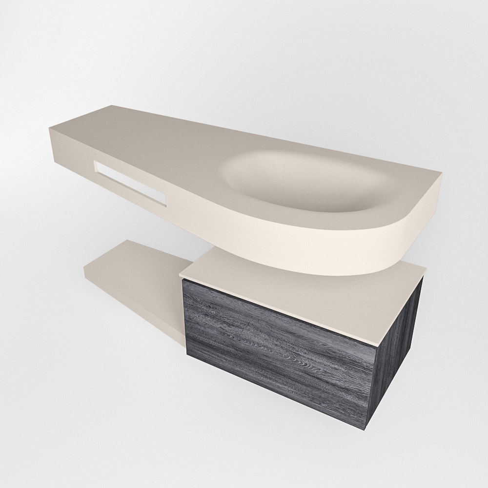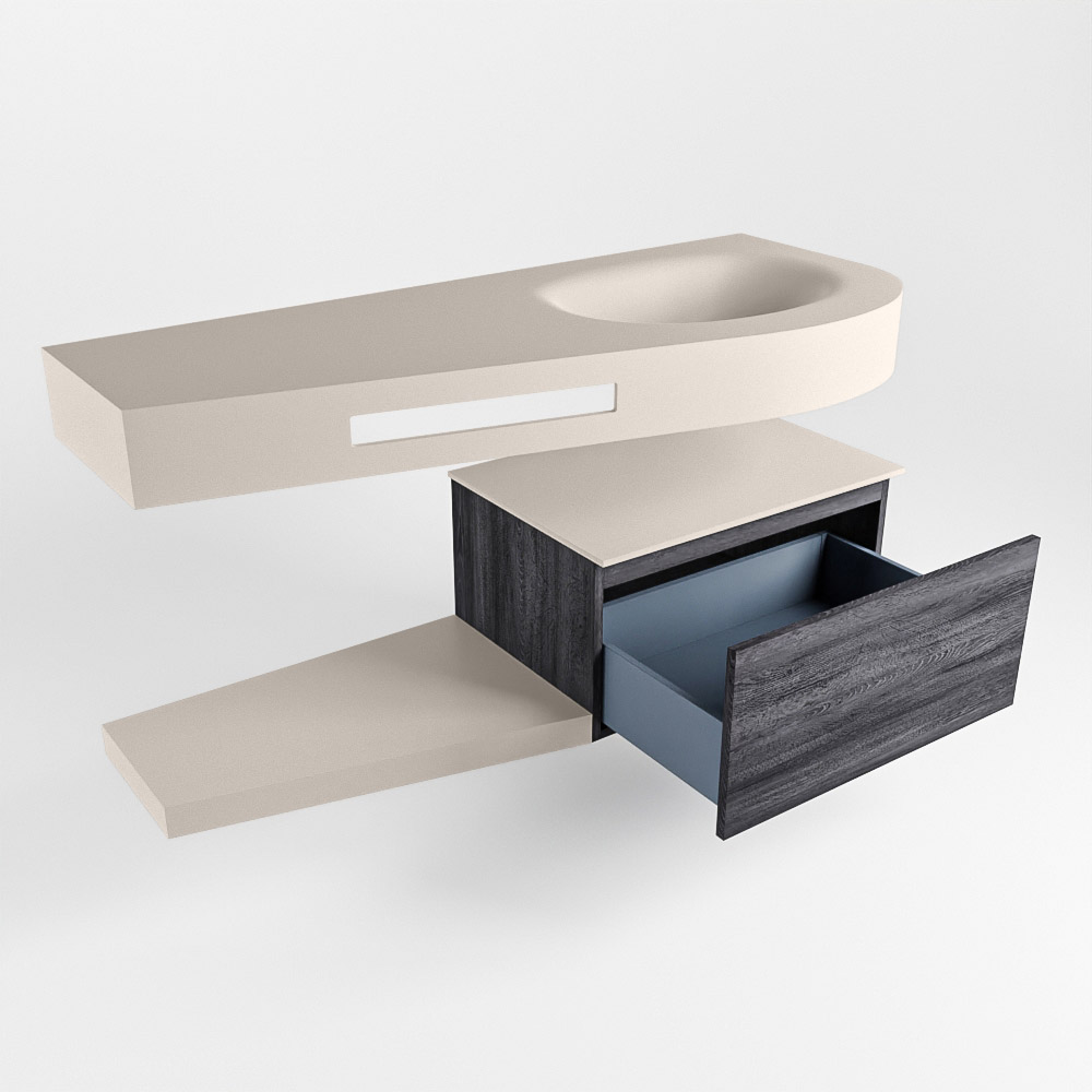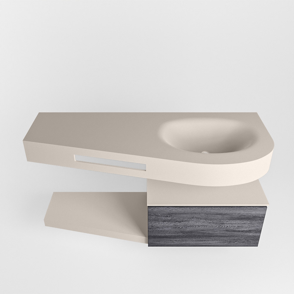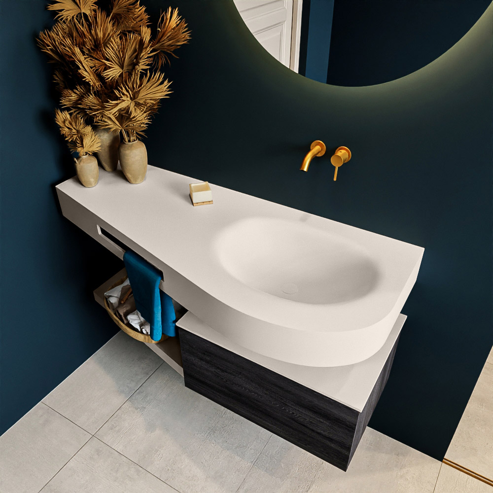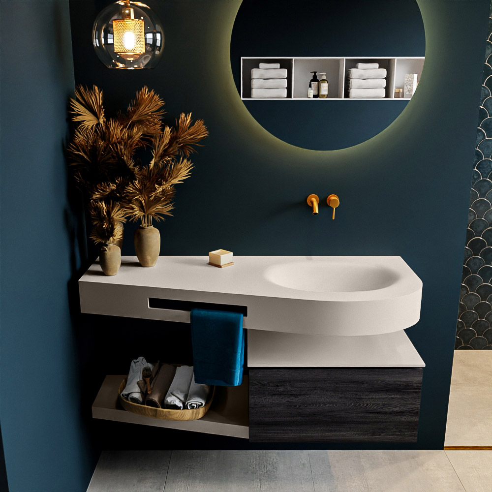 Esta colección no solo se ve hermosa en una lujosa habitación de hotel, sino que también puede ser una pieza central fantástica en su baño. La forma especial del lavabo DULCET y el soporte integrado para toallas aseguran que incluso en baños más pequeños puedas disfrutar de esta elegancia de hotel. El mueble de baño en estas imágenes es el mueble de baño RIVA con un gabinete inferior. El RIVA tiene un gabinete inferior suspendido con 1 cajón, en el que hay espacio suficiente para sus artículos de baño. El estante de superficie sólida tiene la misma forma cónica que el lavabo. El estante le brinda espacio para mostrar hermosos productos de baño.