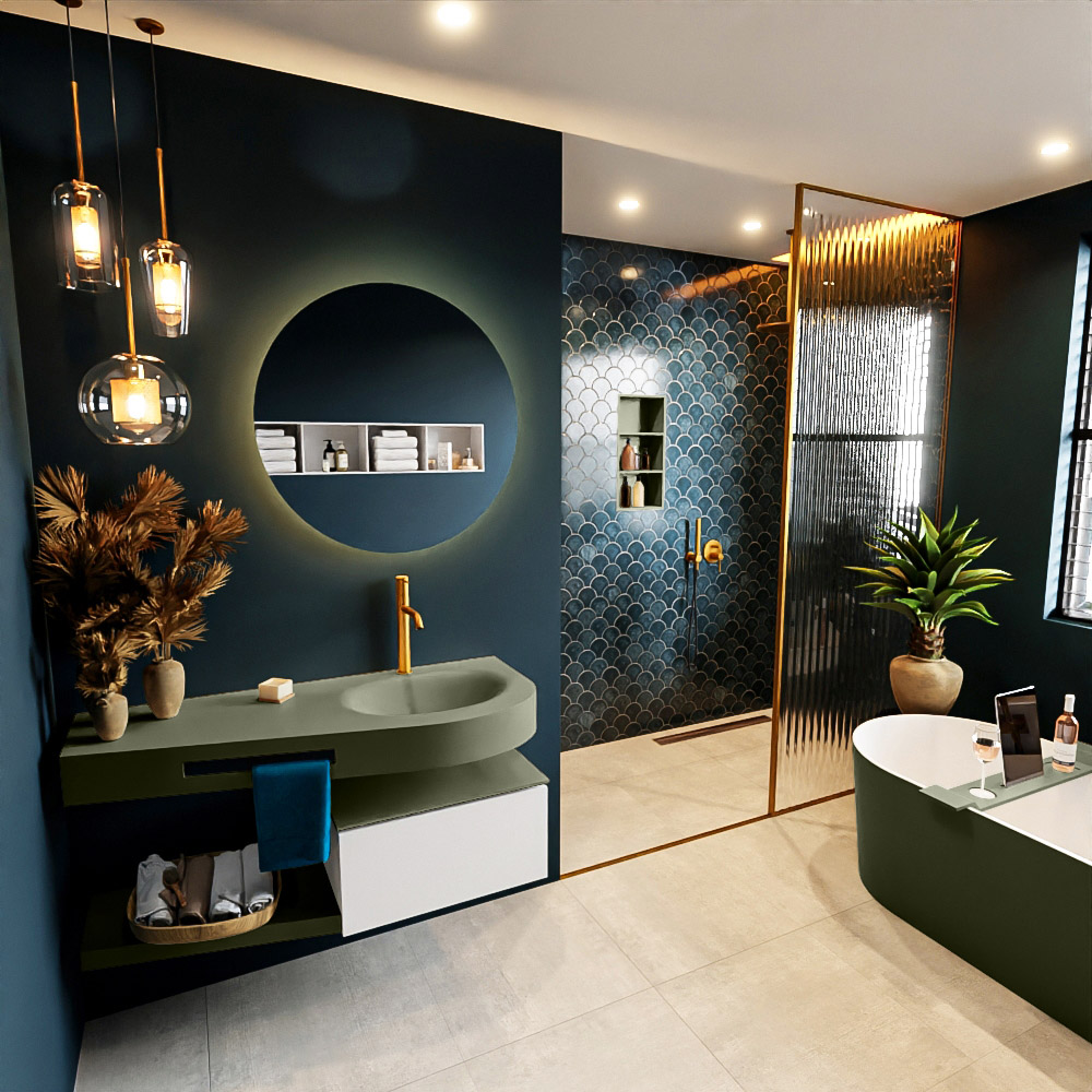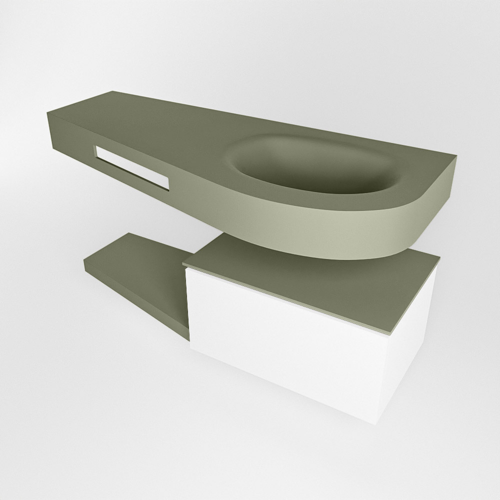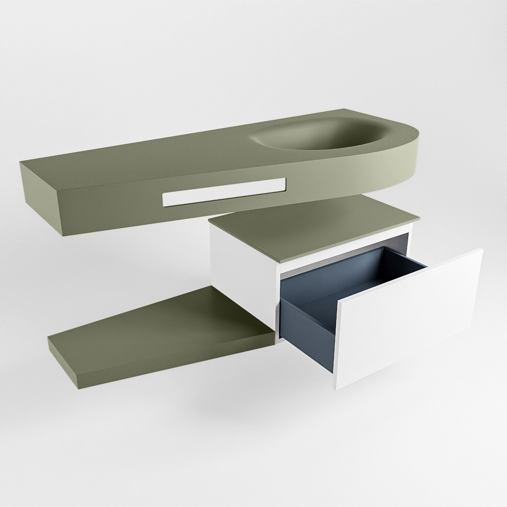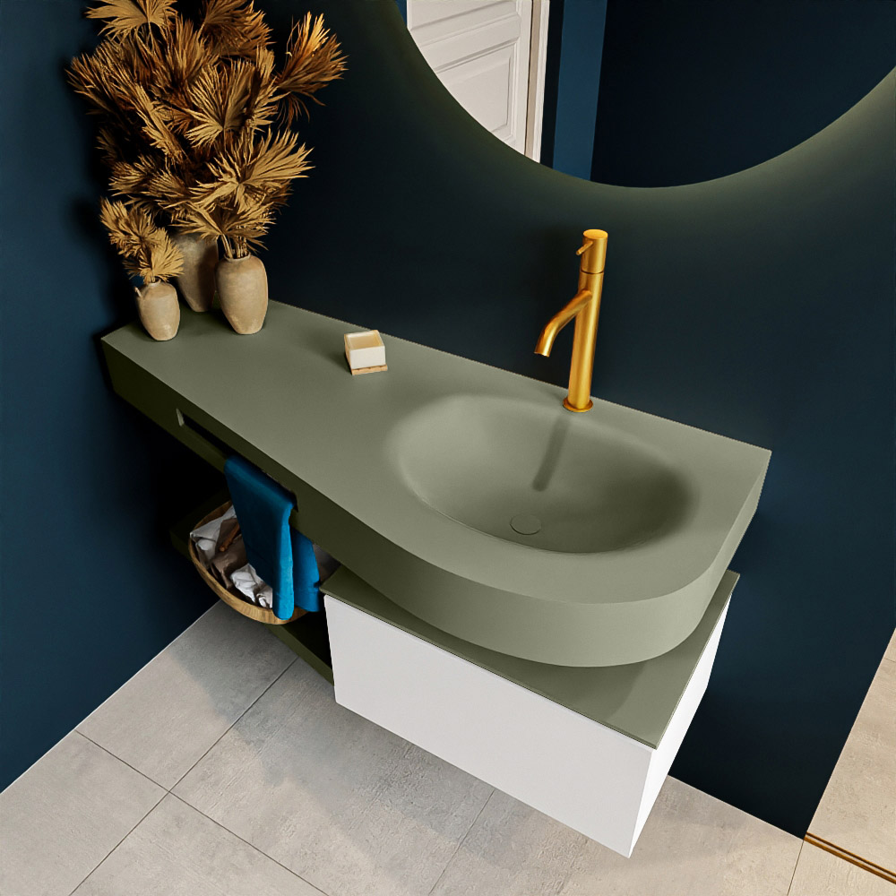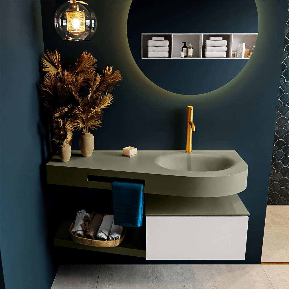 Esta colección no solo se ve hermosa en una lujosa habitación de hotel, sino que también puede ser una pieza central fantástica en su baño. La forma especial del lavabo DULCET y el soporte integrado para toallas aseguran que incluso en baños más pequeños puedas disfrutar de esta elegancia de hotel. El mueble de baño en estas imágenes es el mueble de baño RIVA con un gabinete inferior. El RIVA tiene un gabinete inferior suspendido con 1 cajón, en el que hay espacio suficiente para sus artículos de baño. El estante de superficie sólida tiene la misma forma cónica que el lavabo. El estante le brinda espacio para mostrar hermosos productos de baño.