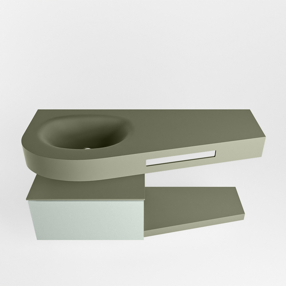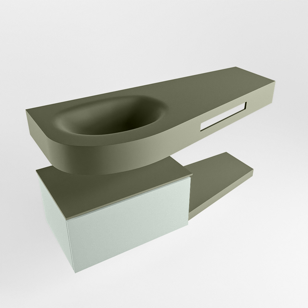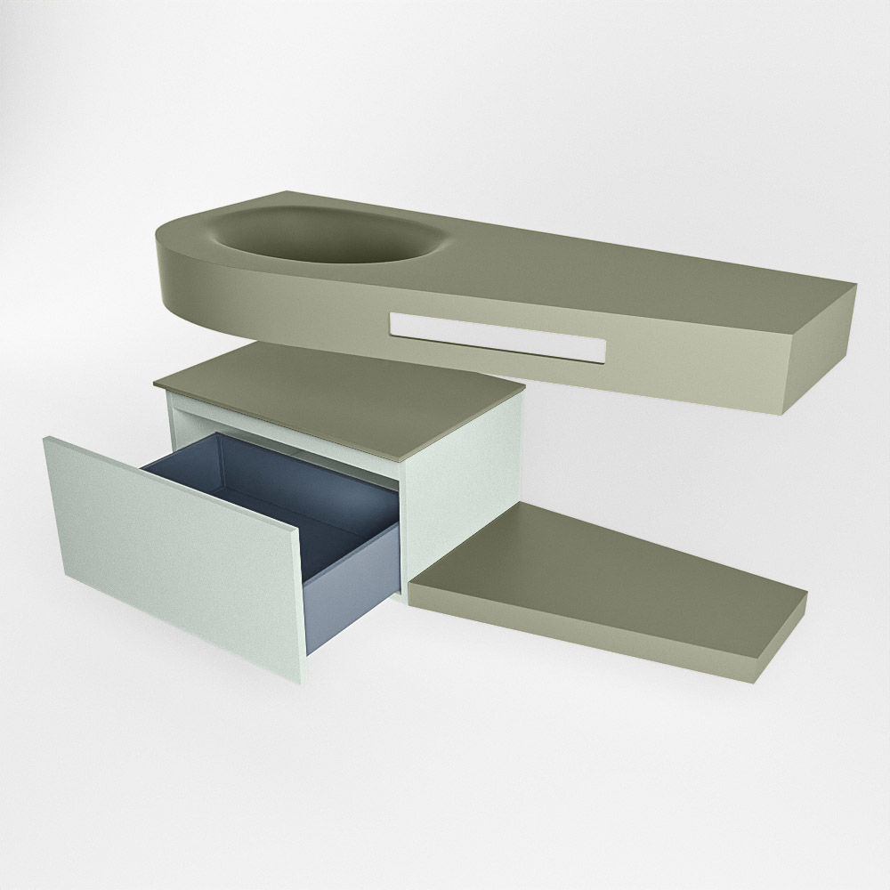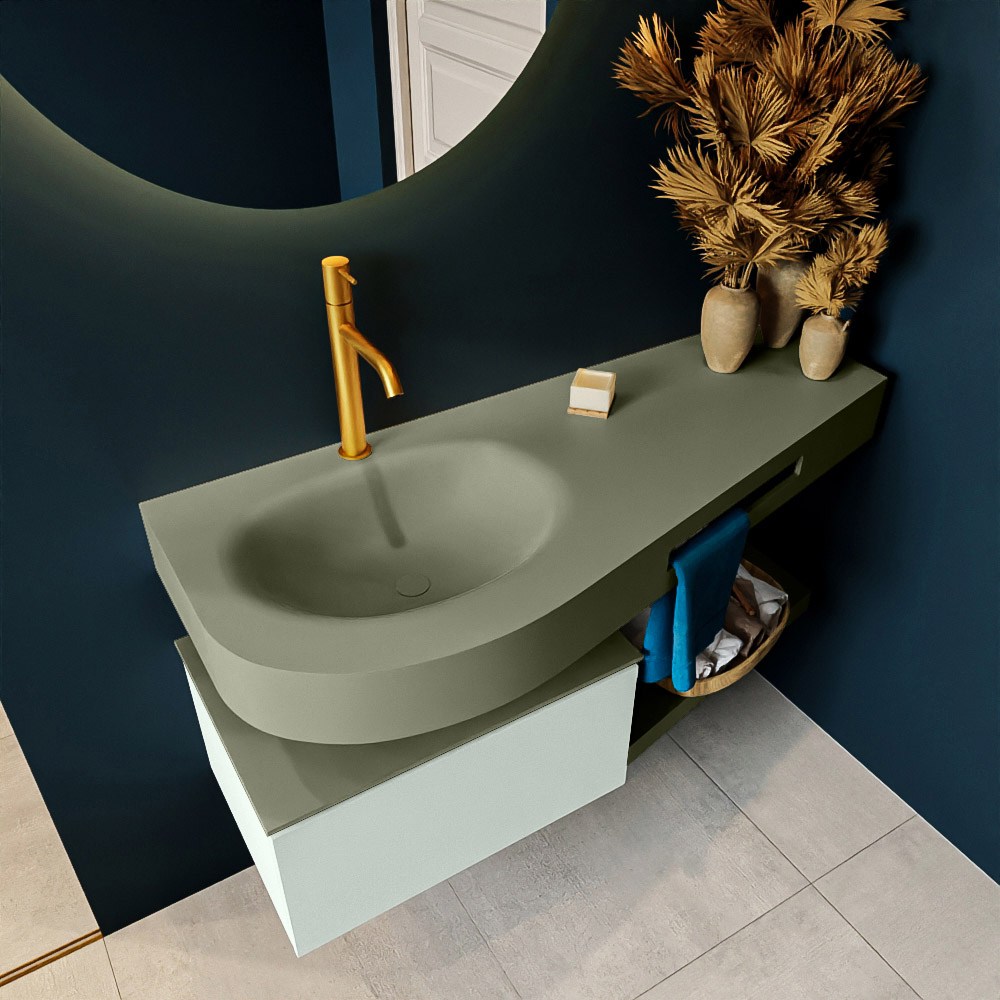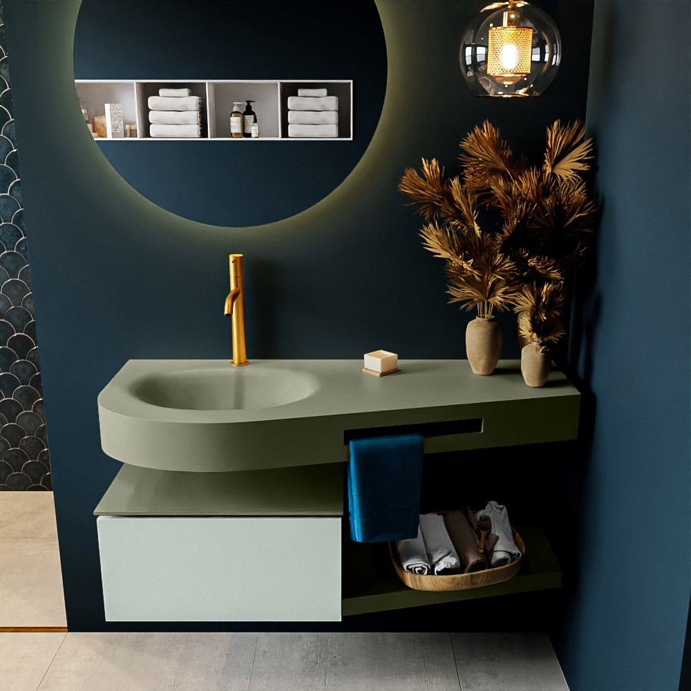 Esta colección no solo se ve hermosa en una lujosa habitación de hotel, sino que también puede ser una pieza central fantástica en su baño. La forma especial del lavabo DULCET y el soporte integrado para toallas aseguran que incluso en baños más pequeños puedas disfrutar de esta elegancia de hotel. El mueble de baño en estas imágenes es el mueble de baño RIVA con un gabinete inferior. El RIVA tiene un gabinete inferior suspendido con 1 cajón, en el que hay espacio suficiente para sus artículos de baño. El estante de superficie sólida tiene la misma forma cónica que el lavabo. El estante le brinda espacio para mostrar hermosos productos de baño.