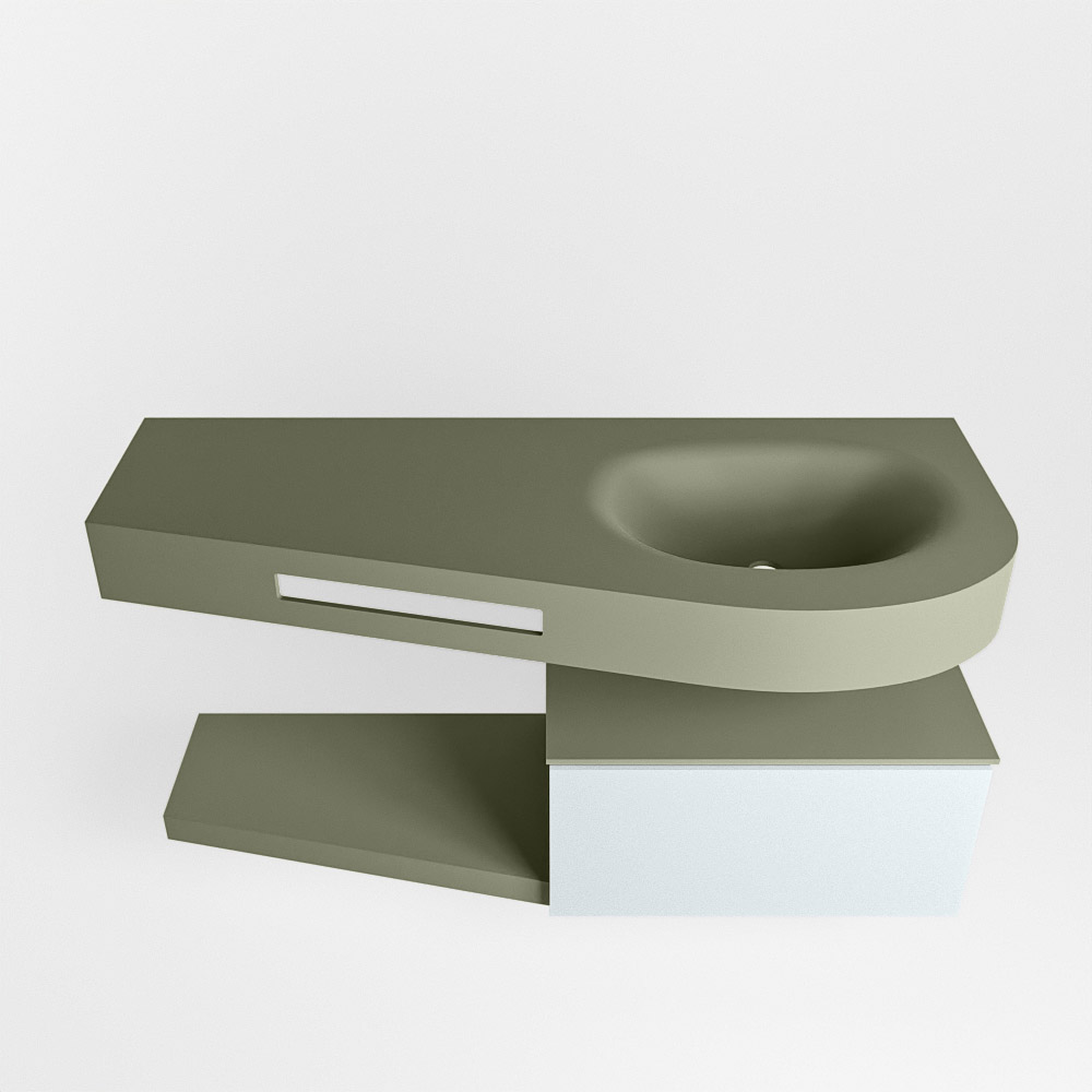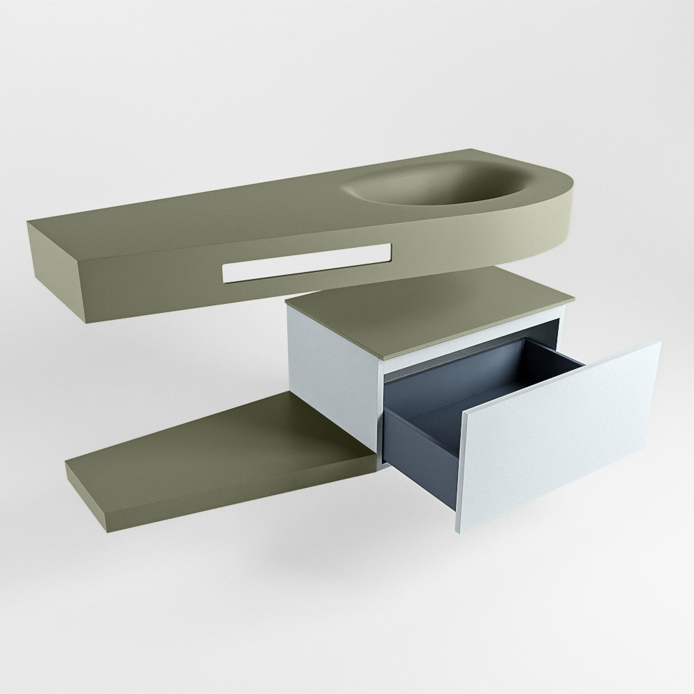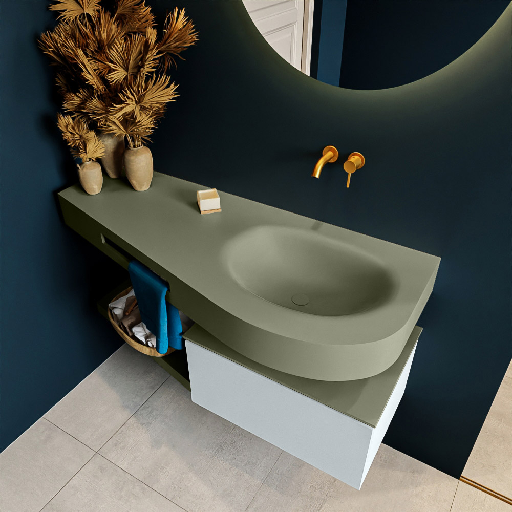 Esta colección no solo se ve hermosa en una lujosa habitación de hotel, sino que también puede ser una pieza central fantástica en su baño. La forma especial del lavabo DULCET y el soporte integrado para toallas aseguran que incluso en baños más pequeños puedas disfrutar de esta elegancia de hotel. El mueble de baño en estas imágenes es el mueble de baño RIVA con un gabinete inferior. El RIVA tiene un gabinete inferior suspendido con 1 cajón, en el que hay espacio suficiente para sus artículos de baño. El estante de superficie sólida tiene la misma forma cónica que el lavabo. El estante le brinda espacio para mostrar hermosos productos de baño.