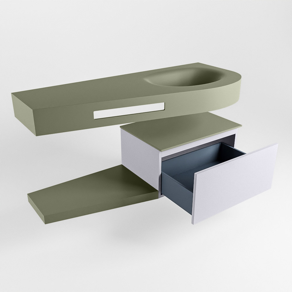 Esta colección no solo se ve hermosa en una lujosa habitación de hotel, sino que también puede ser una pieza central fantástica en su baño. La forma especial del lavabo DULCET y el soporte integrado para toallas aseguran que incluso en baños más pequeños puedas disfrutar de esta elegancia de hotel. El mueble de baño en estas imágenes es el mueble de baño RIVA con un gabinete inferior. El RIVA tiene un gabinete inferior suspendido con 1 cajón, en el que hay espacio suficiente para sus artículos de baño. El estante de superficie sólida tiene la misma forma cónica que el lavabo. El estante le brinda espacio para mostrar hermosos productos de baño.