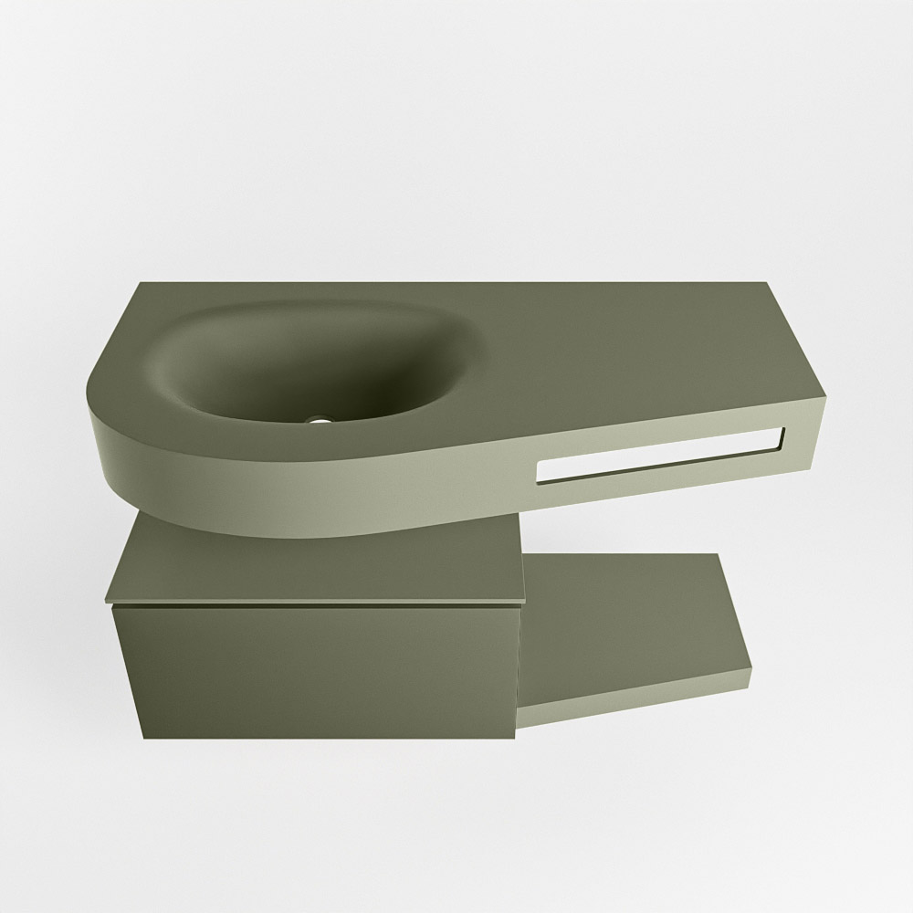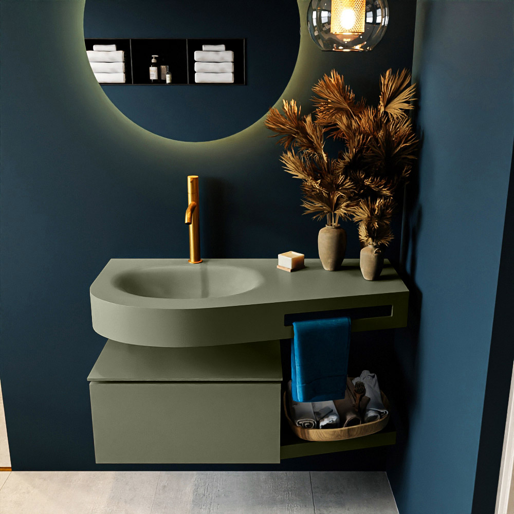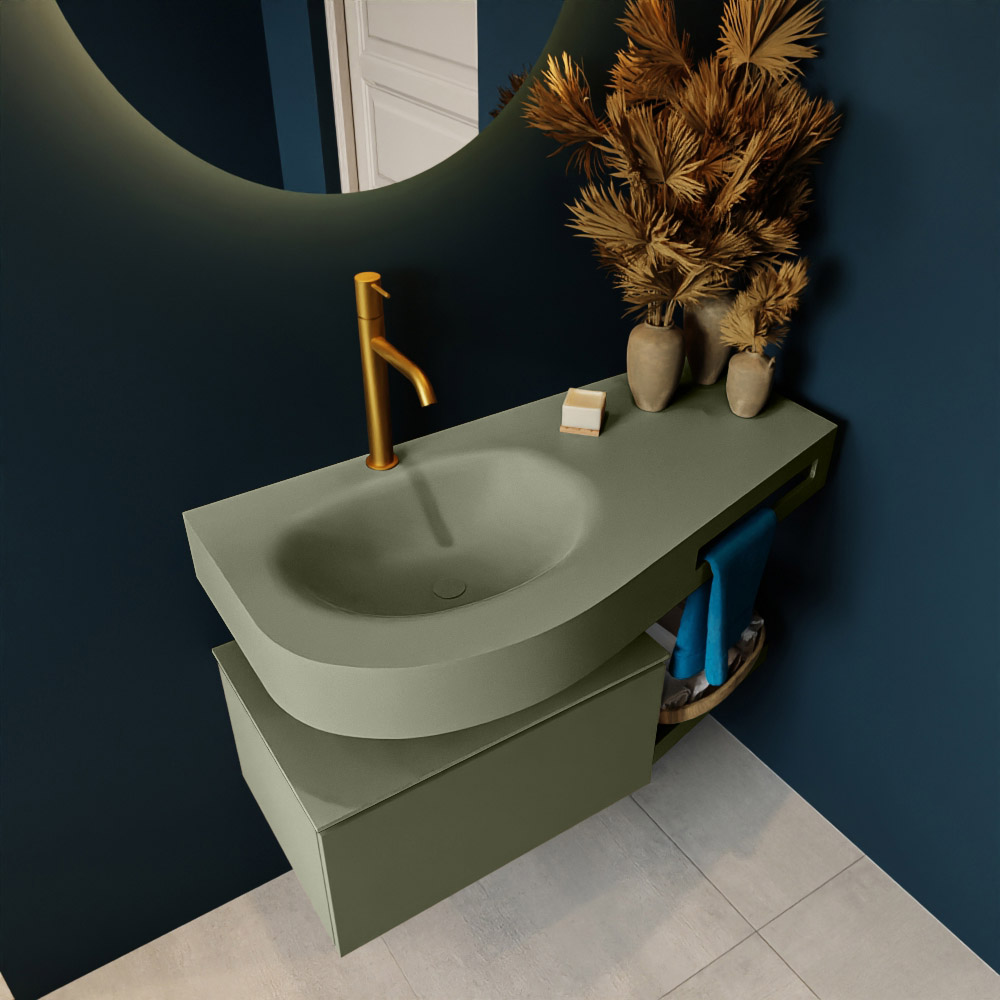 Esta colección no solo se ve hermosa en una lujosa habitación de hotel, sino que también puede ser una pieza central fantástica en su baño. La forma especial del lavabo DULCET y el soporte integrado para toallas aseguran que incluso en baños más pequeños puedas disfrutar de esta elegancia de hotel. El mueble de baño en estas imágenes es el mueble de baño RIVA con un gabinete inferior. El RIVA tiene un gabinete inferior suspendido con 1 cajón, en el que hay espacio suficiente para sus artículos de baño. El estante de superficie sólida tiene la misma forma cónica que el lavabo. El estante le brinda espacio para mostrar hermosos productos de baño.