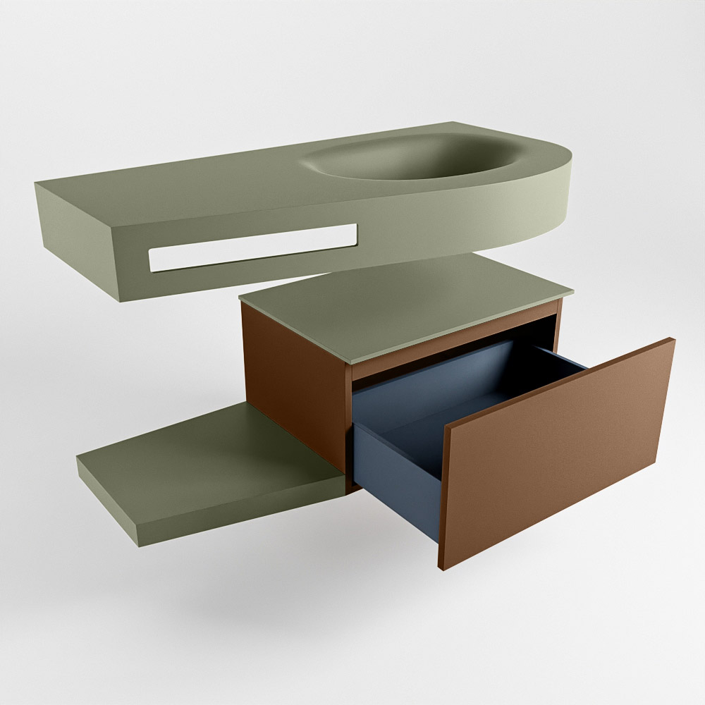Esta colección no solo se ve hermosa en una lujosa habitación de hotel, sino que también puede ser una pieza central fantástica en su baño. La forma especial del lavabo DULCET y el soporte integrado para toallas aseguran que incluso en baños más pequeños puedas disfrutar de esta elegancia de hotel. El mueble de baño en estas imágenes es el mueble de baño RIVA con un gabinete inferior. El RIVA tiene un gabinete inferior suspendido con 1 cajón, en el que hay espacio suficiente para sus artículos de baño. El estante de superficie sólida tiene la misma forma cónica que el lavabo. El estante le brinda espacio para mostrar hermosos productos de baño.