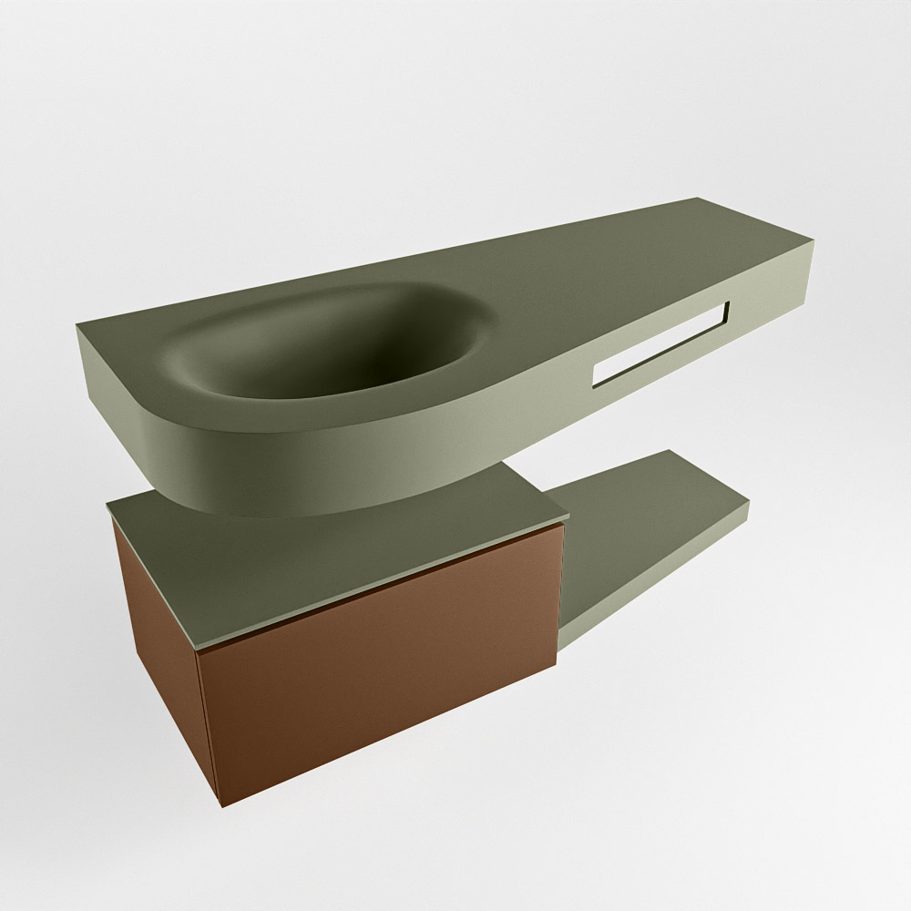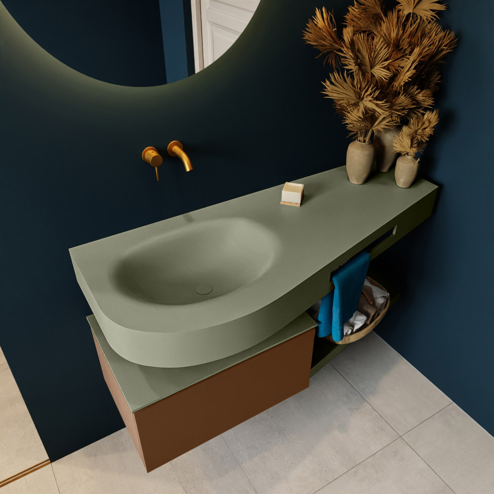 Esta colección no solo se ve hermosa en una lujosa habitación de hotel, sino que también puede ser una pieza central fantástica en su baño. La forma especial del lavabo DULCET y el soporte integrado para toallas aseguran que incluso en baños más pequeños puedas disfrutar de esta elegancia de hotel. El mueble de baño en estas imágenes es el mueble de baño RIVA con un gabinete inferior. El RIVA tiene un gabinete inferior suspendido con 1 cajón, en el que hay espacio suficiente para sus artículos de baño. El estante de superficie sólida tiene la misma forma cónica que el lavabo. El estante le brinda espacio para mostrar hermosos productos de baño.