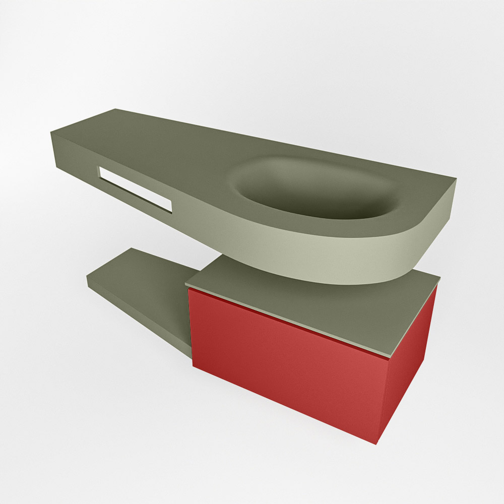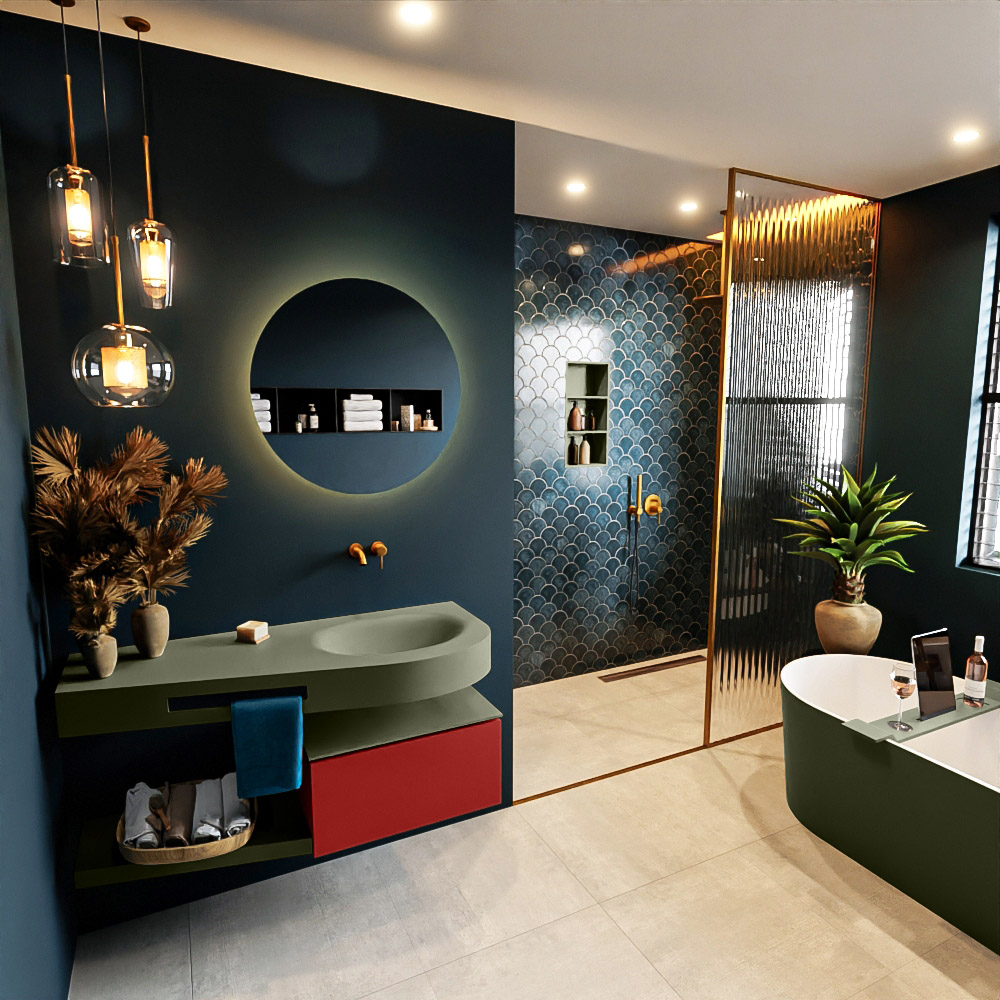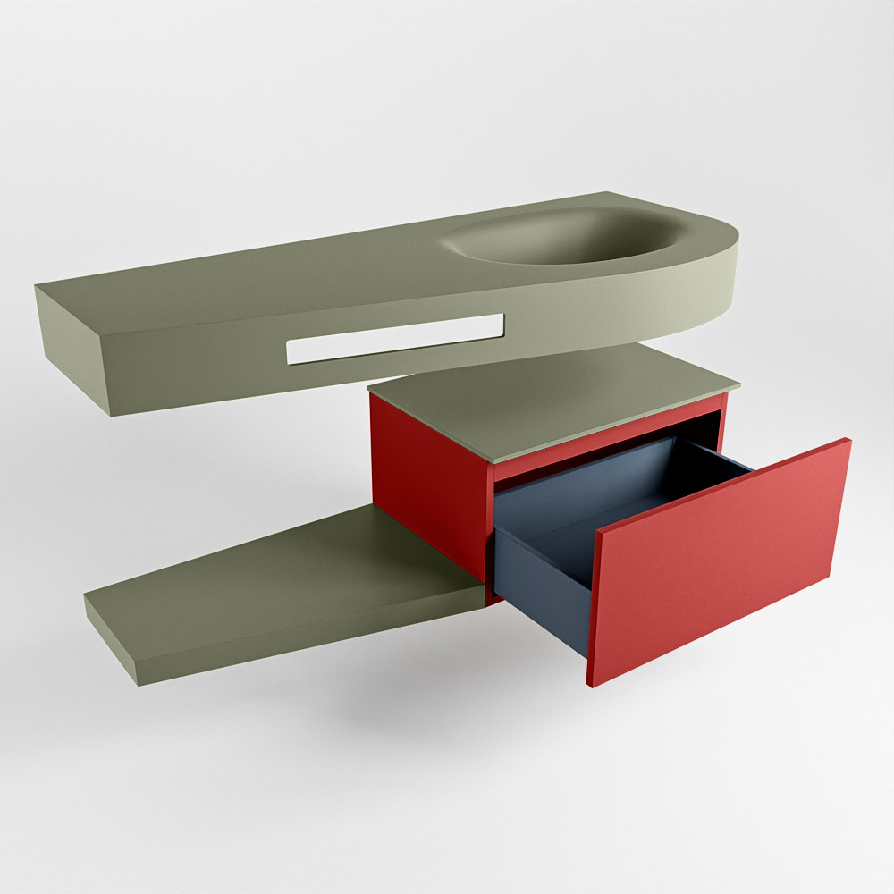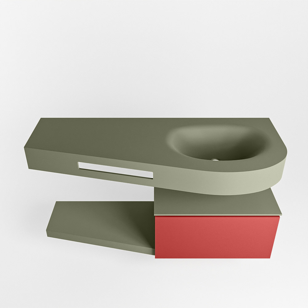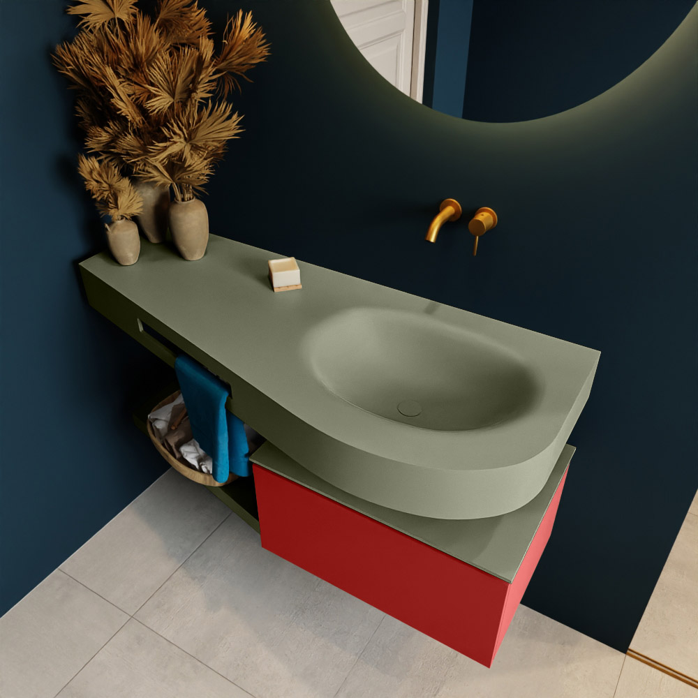 Esta colección no solo se ve hermosa en una lujosa habitación de hotel, sino que también puede ser una pieza central fantástica en su baño. La forma especial del lavabo DULCET y el soporte integrado para toallas aseguran que incluso en baños más pequeños puedas disfrutar de esta elegancia de hotel. El mueble de baño en estas imágenes es el mueble de baño RIVA con un gabinete inferior. El RIVA tiene un gabinete inferior suspendido con 1 cajón, en el que hay espacio suficiente para sus artículos de baño. El estante de superficie sólida tiene la misma forma cónica que el lavabo. El estante le brinda espacio para mostrar hermosos productos de baño.