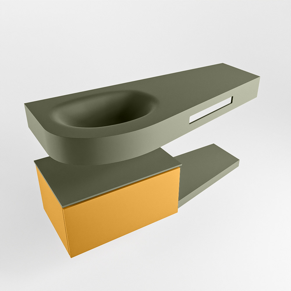 Esta colección no solo se ve hermosa en una lujosa habitación de hotel, sino que también puede ser una pieza central fantástica en su baño. La forma especial del lavabo DULCET y el soporte integrado para toallas aseguran que incluso en baños más pequeños puedas disfrutar de esta elegancia de hotel. El mueble de baño en estas imágenes es el mueble de baño RIVA con un gabinete inferior. El RIVA tiene un gabinete inferior suspendido con 1 cajón, en el que hay espacio suficiente para sus artículos de baño. El estante de superficie sólida tiene la misma forma cónica que el lavabo. El estante le brinda espacio para mostrar hermosos productos de baño.
