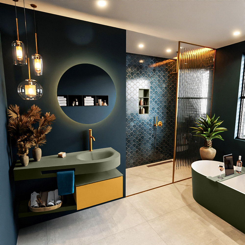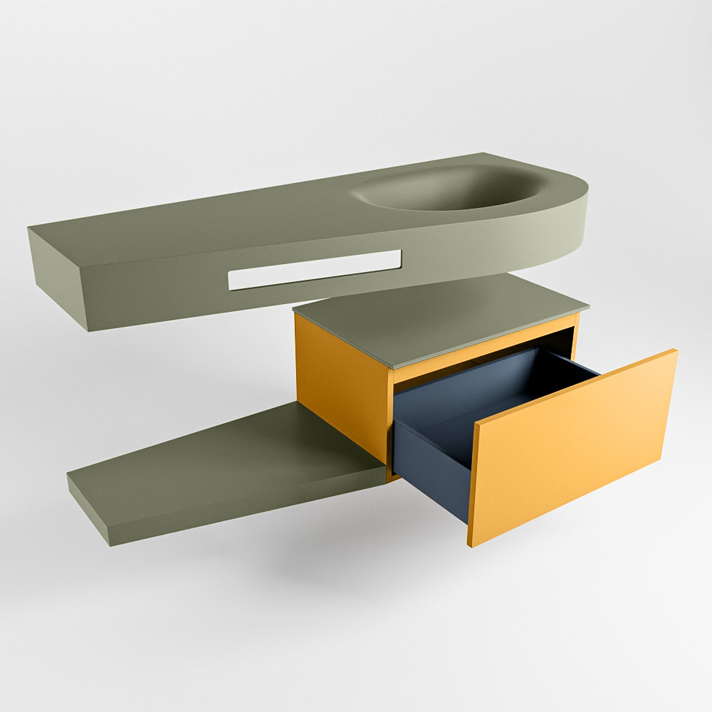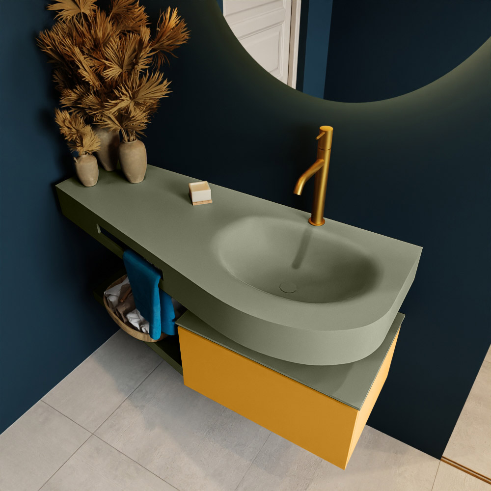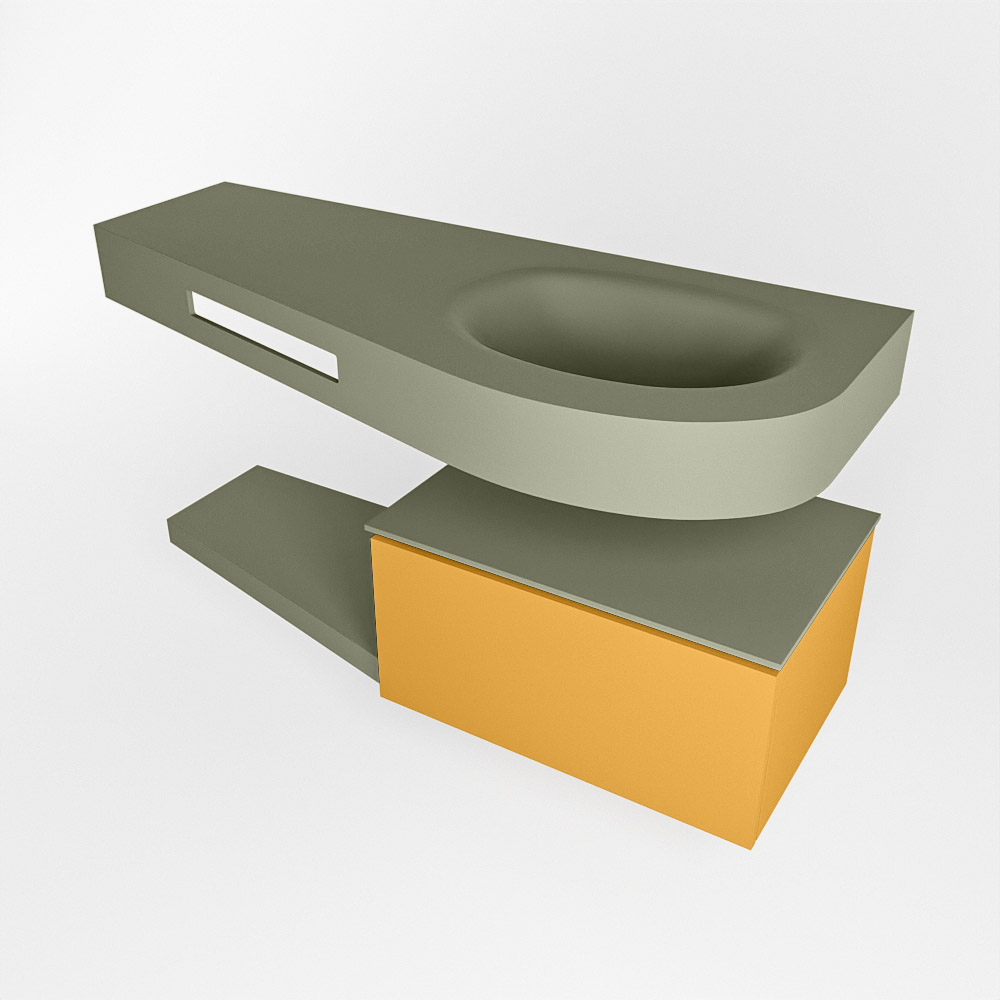 MONDIAZ RIVA 120cm mueble de baño / estante color Ocher con 1 cajón. Lavabo DULCET Derecho 1 orificio, color Army.