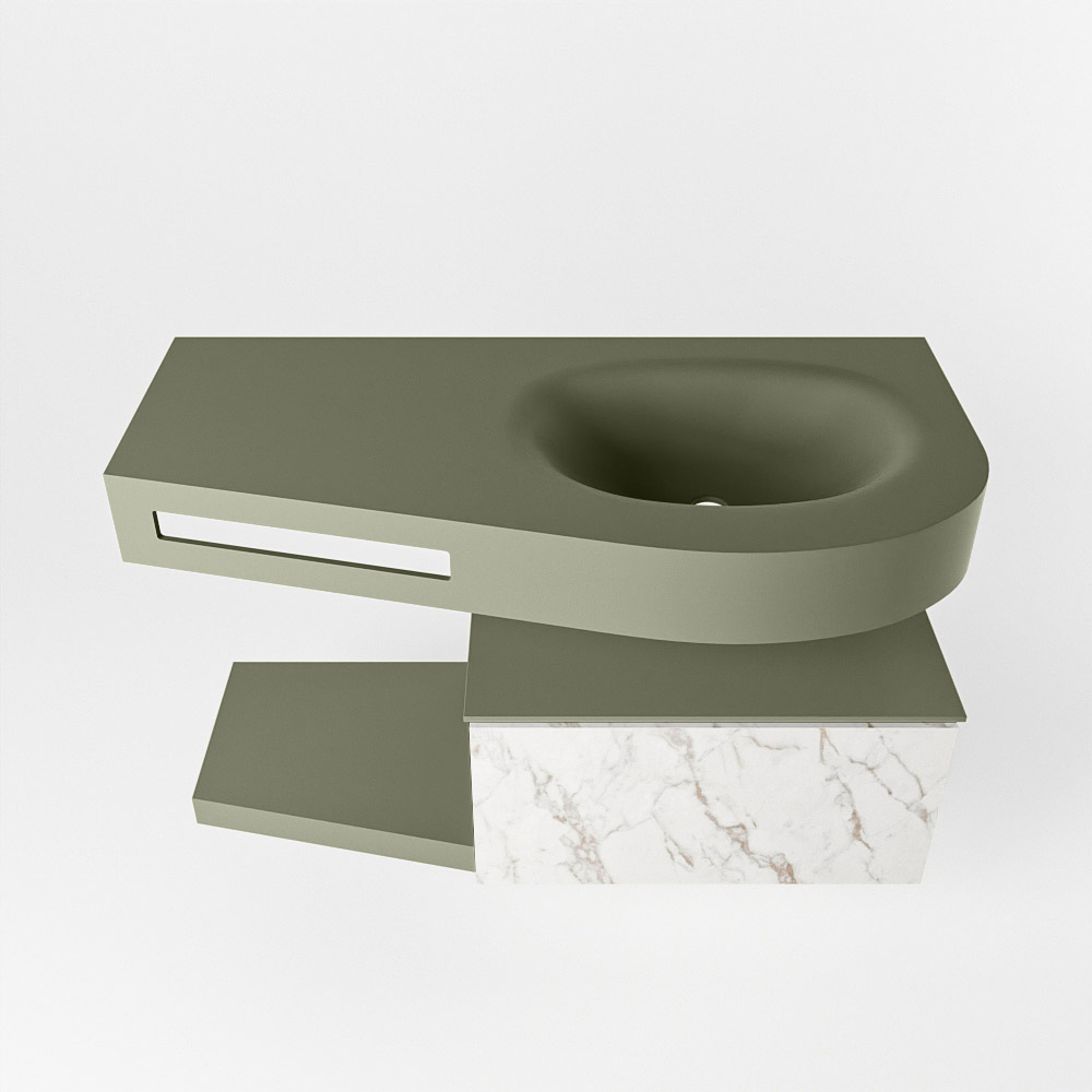 Esta colección no solo se ve hermosa en una lujosa habitación de hotel, sino que también puede ser una pieza central fantástica en su baño. La forma especial del lavabo DULCET y el soporte integrado para toallas aseguran que incluso en baños más pequeños puedas disfrutar de esta elegancia de hotel. El mueble de baño en estas imágenes es el mueble de baño RIVA con un gabinete inferior. El RIVA tiene un gabinete inferior suspendido con 1 cajón, en el que hay espacio suficiente para sus artículos de baño. El estante de superficie sólida tiene la misma forma cónica que el lavabo. El estante le brinda espacio para mostrar hermosos productos de baño.