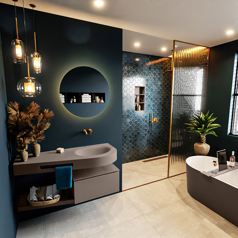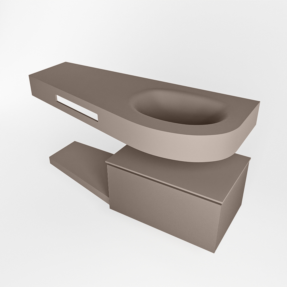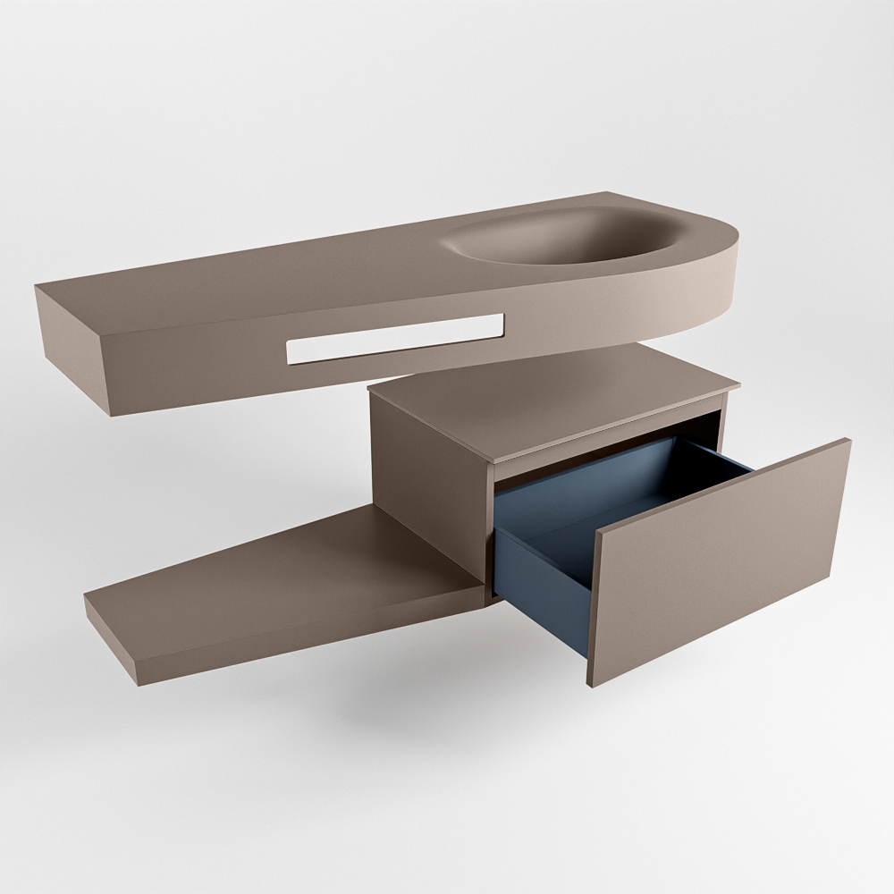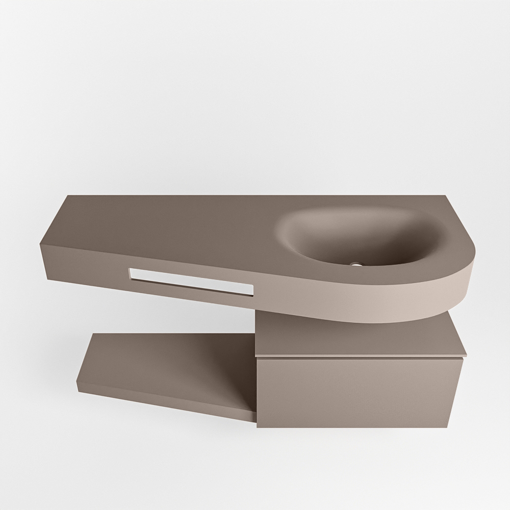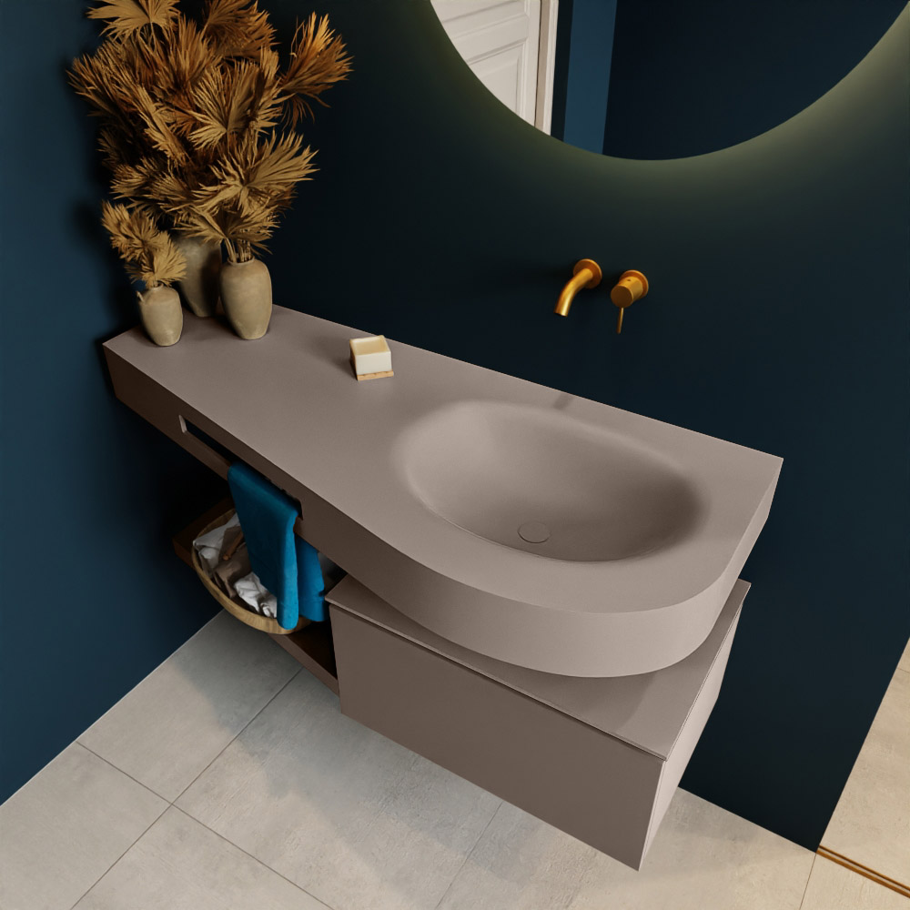 Esta colección no solo se ve hermosa en una lujosa habitación de hotel, sino que también puede ser una pieza central fantástica en su baño. La forma especial del lavabo DULCET y el soporte integrado para toallas aseguran que incluso en baños más pequeños puedas disfrutar de esta elegancia de hotel. El mueble de baño en estas imágenes es el mueble de baño RIVA con un gabinete inferior. El RIVA tiene un gabinete inferior suspendido con 1 cajón, en el que hay espacio suficiente para sus artículos de baño. El estante de superficie sólida tiene la misma forma cónica que el lavabo. El estante le brinda espacio para mostrar hermosos productos de baño.