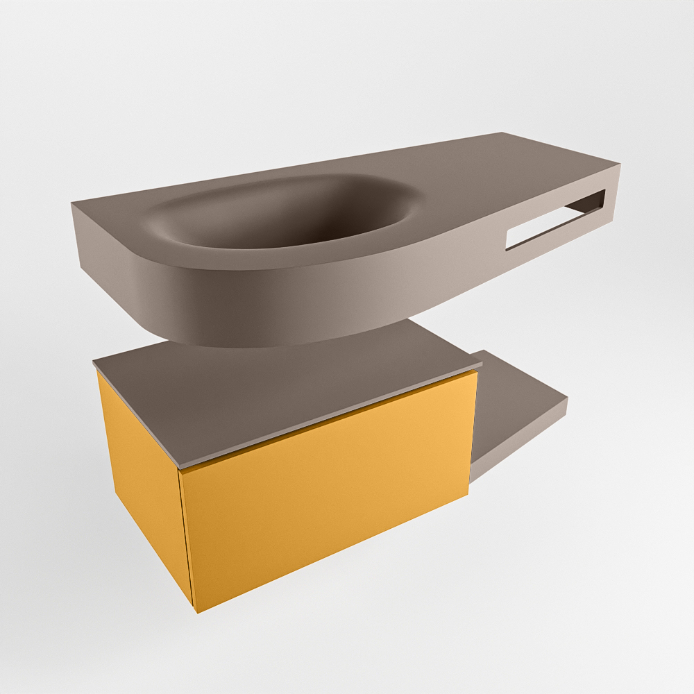Esta colección no solo se ve hermosa en una lujosa habitación de hotel, sino que también puede ser una pieza central fantástica en su baño. La forma especial del lavabo DULCET y el soporte integrado para toallas aseguran que incluso en baños más pequeños puedas disfrutar de esta elegancia de hotel. El mueble de baño en estas imágenes es el mueble de baño RIVA con un gabinete inferior. El RIVA tiene un gabinete inferior suspendido con 1 cajón, en el que hay espacio suficiente para sus artículos de baño. El estante de superficie sólida tiene la misma forma cónica que el lavabo. El estante le brinda espacio para mostrar hermosos productos de baño.