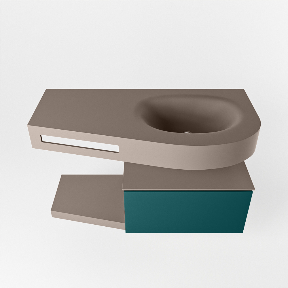 Esta colección no solo se ve hermosa en una lujosa habitación de hotel, sino que también puede ser una pieza central fantástica en su baño. La forma especial del lavabo DULCET y el soporte integrado para toallas aseguran que incluso en baños más pequeños puedas disfrutar de esta elegancia de hotel. El mueble de baño en estas imágenes es el mueble de baño RIVA con un gabinete inferior. El RIVA tiene un gabinete inferior suspendido con 1 cajón, en el que hay espacio suficiente para sus artículos de baño. El estante de superficie sólida tiene la misma forma cónica que el lavabo. El estante le brinda espacio para mostrar hermosos productos de baño.