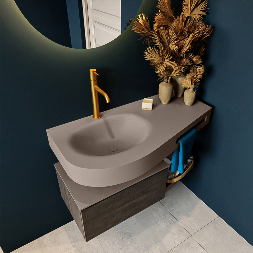 Esta colección no solo se ve hermosa en una lujosa habitación de hotel, sino que también puede ser una pieza central fantástica en su baño. La forma especial del lavabo DULCET y el soporte integrado para toallas aseguran que incluso en baños más pequeños puedas disfrutar de esta elegancia de hotel. El mueble de baño en estas imágenes es el mueble de baño RIVA con un gabinete inferior. El RIVA tiene un gabinete inferior suspendido con 1 cajón, en el que hay espacio suficiente para sus artículos de baño. El estante de superficie sólida tiene la misma forma cónica que el lavabo. El estante le brinda espacio para mostrar hermosos productos de baño.
