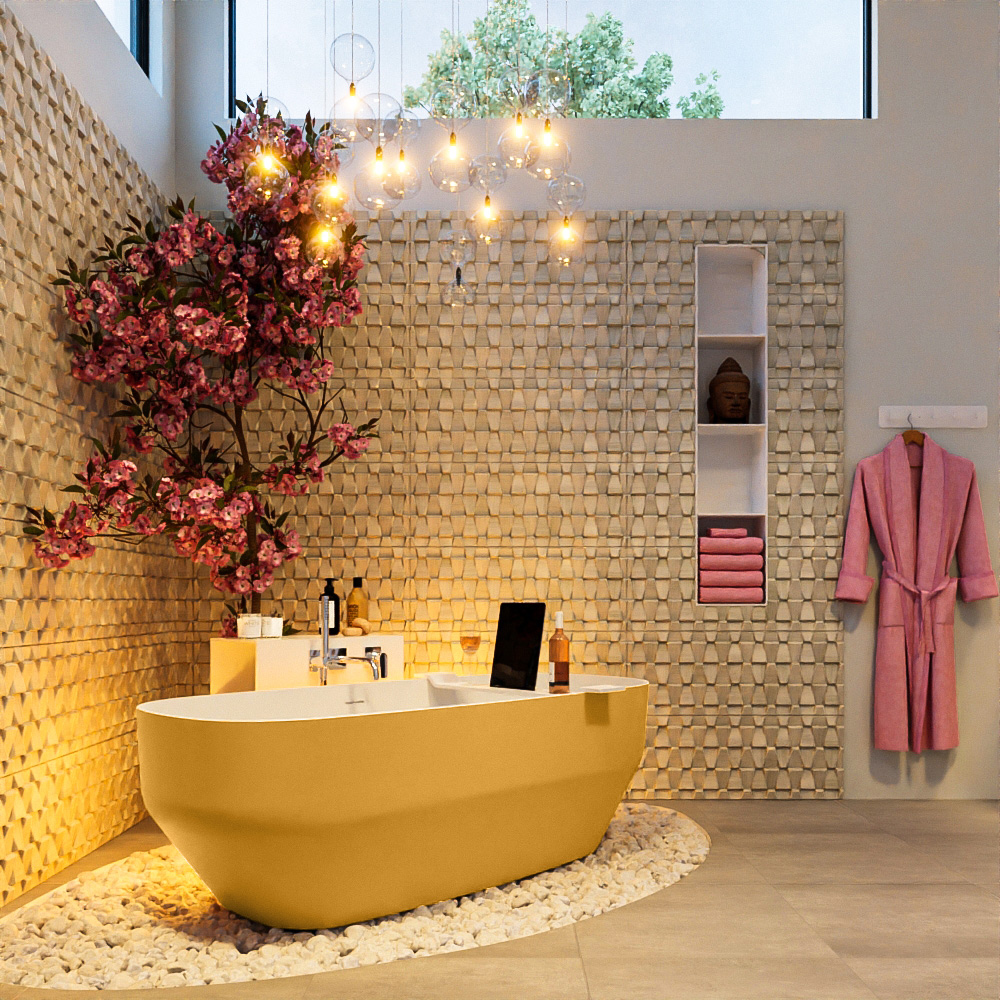 La STONE tiene un bonito perfil y una forma de descanso fantástica. Una joya en el baño. En esta hermosa disposición de baño luminosa, se ha optado por un lavabo de Solid Surface suspendido modelo AVON con un espacio para toallas. Este se puede colocar en cualquier lugar deseado. La base es un mueble de la serie Loor con una encimera de Solid Surface. Este mueble puede coincidir perfectamente en colores con la bañera. Elige tu color favorito y crea tu baño de ensueño.
