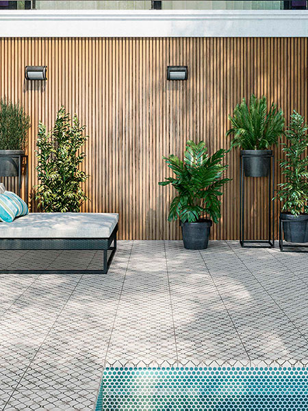 Con el acabado Smart Grip las decoraciones, colores, texturas y tonalidades permanecen inalterados, pero ofrecen la ventaja de abrir nuevas posibilidades de diseño: ahora podemos dar continuidad del salón a la terraza, del interior al exterior, sin depender de los formatos ni de los tonos. La colocación sin límites de los pavimentos Smart Grip nos aporta la consonancia estética