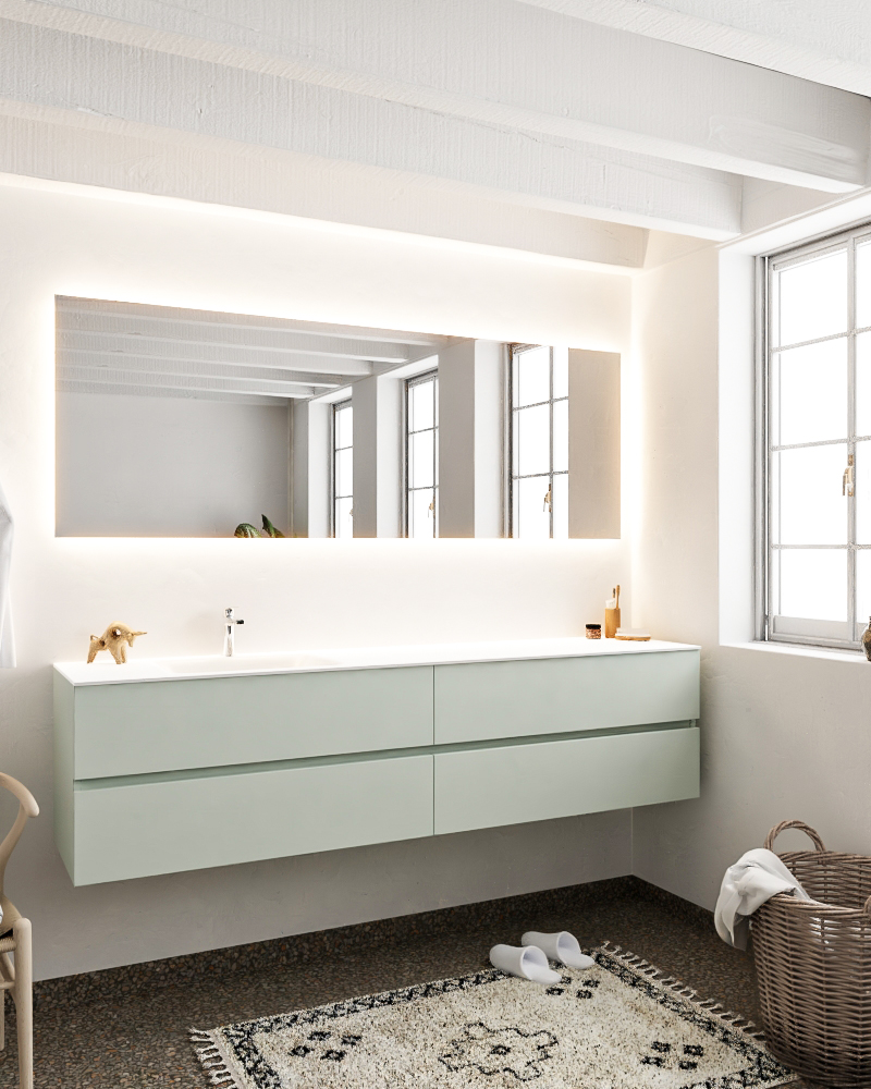 Ya sea que elija color o un aspecto de madera, un mueble de baño a medida, con o sin agujeros para grifos, el conjunto de muebles de baño Vica lo tiene todo. Con la colección de muebles de baño Vica, puede elegir entre 3 modelos de lavabos: CLOUD y MOON en Solid Surface, con opciones de lavabo a la derecha, izquierda, en el medio o doble, y con o sin agujeros para grifos. También está el lavabo de cerámica DENIA con opciones en el medio o doble. Además, se ofrece la posibilidad de personalización.