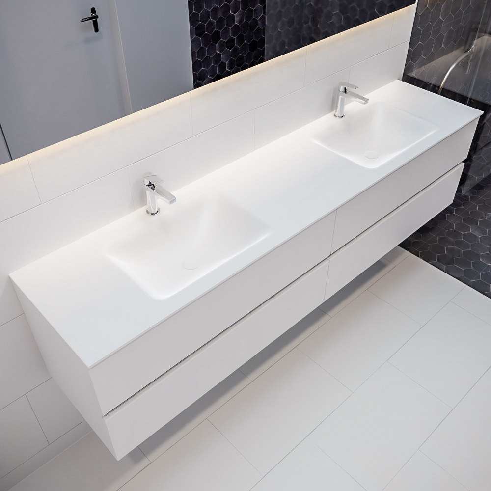 Ya sea que elija color o un aspecto de madera, un mueble de baño a medida, con o sin agujeros para grifos, el conjunto de muebles de baño Vica lo tiene todo. Con la colección de muebles de baño Vica, puede elegir entre 3 modelos de lavabos: CLOUD y MOON en Solid Surface, con opciones de lavabo a la derecha, izquierda, en el medio o doble, y con o sin agujeros para grifos. También está el lavabo de cerámica DENIA con opciones en el medio o doble. Además, se ofrece la posibilidad de personalización.