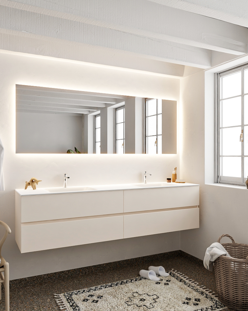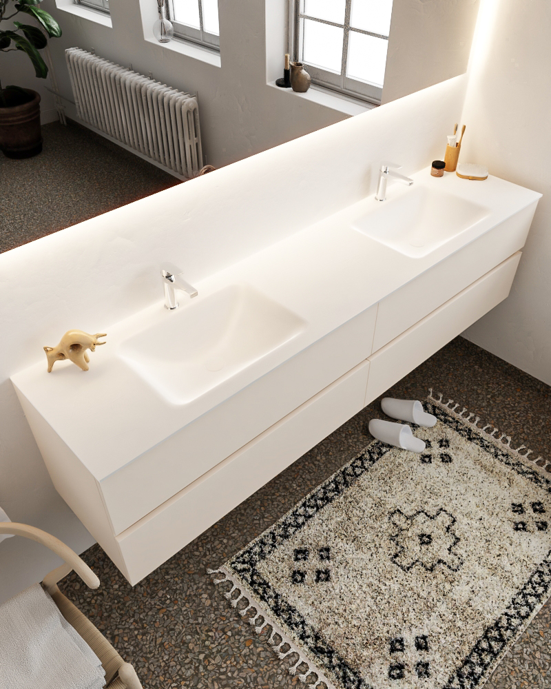 Ya sea que elija color o un aspecto de madera, un mueble de baño a medida, con o sin agujeros para grifos, el conjunto de muebles de baño Vica lo tiene todo. Con la colección de muebles de baño Vica, puede elegir entre 3 modelos de lavabos: CLOUD y MOON en Solid Surface, con opciones de lavabo a la derecha, izquierda, en el medio o doble, y con o sin agujeros para grifos. También está el lavabo de cerámica DENIA con opciones en el medio o doble. Además, se ofrece la posibilidad de personalización.