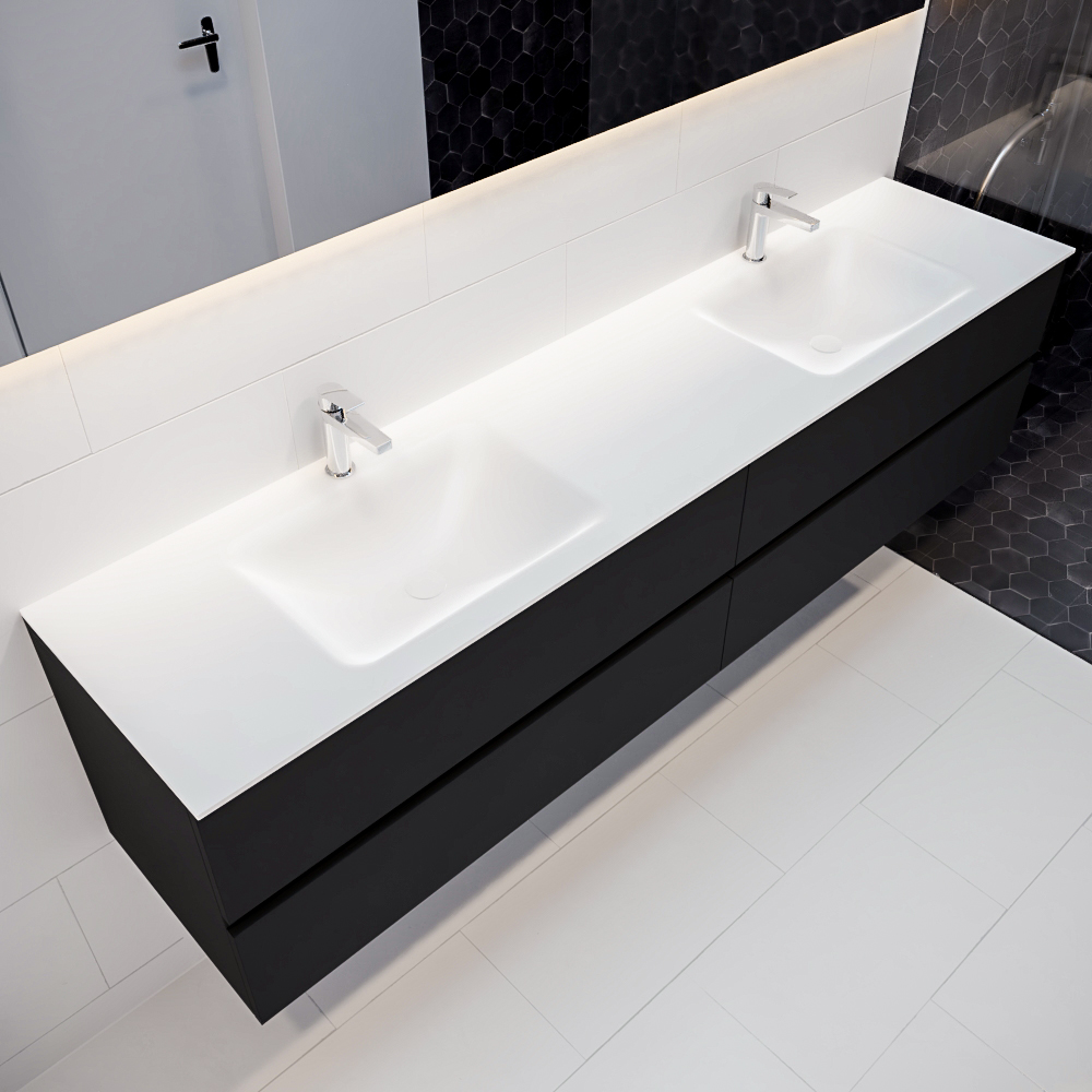 Ya sea que elija color o un aspecto de madera, un mueble de baño a medida, con o sin agujeros para grifos, el conjunto de muebles de baño Vica lo tiene todo. Con la colección de muebles de baño Vica, puede elegir entre 3 modelos de lavabos: CLOUD y MOON en Solid Surface, con opciones de lavabo a la derecha, izquierda, en el medio o doble, y con o sin agujeros para grifos. También está el lavabo de cerámica DENIA con opciones en el medio o doble. Además, se ofrece la posibilidad de personalización.