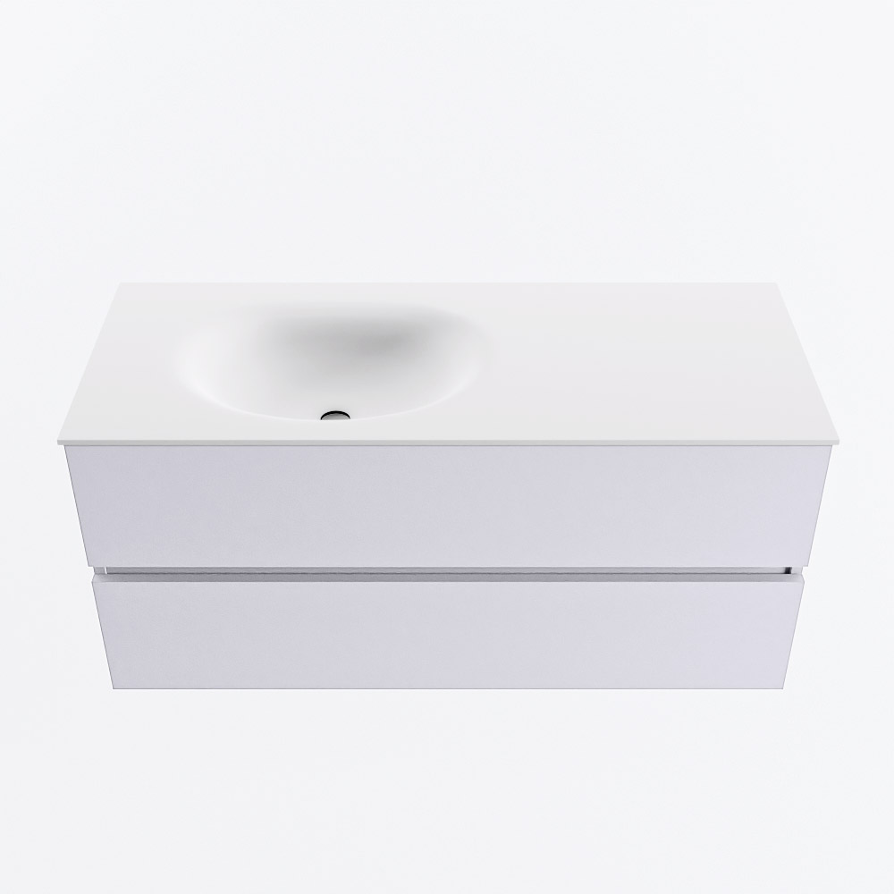 MONDIAZ RIVA 120cm mueble de baño / estante color Carrara con 1 cajón. Lavabo DULCET Izquierda sin orificio, color Dark Grey.