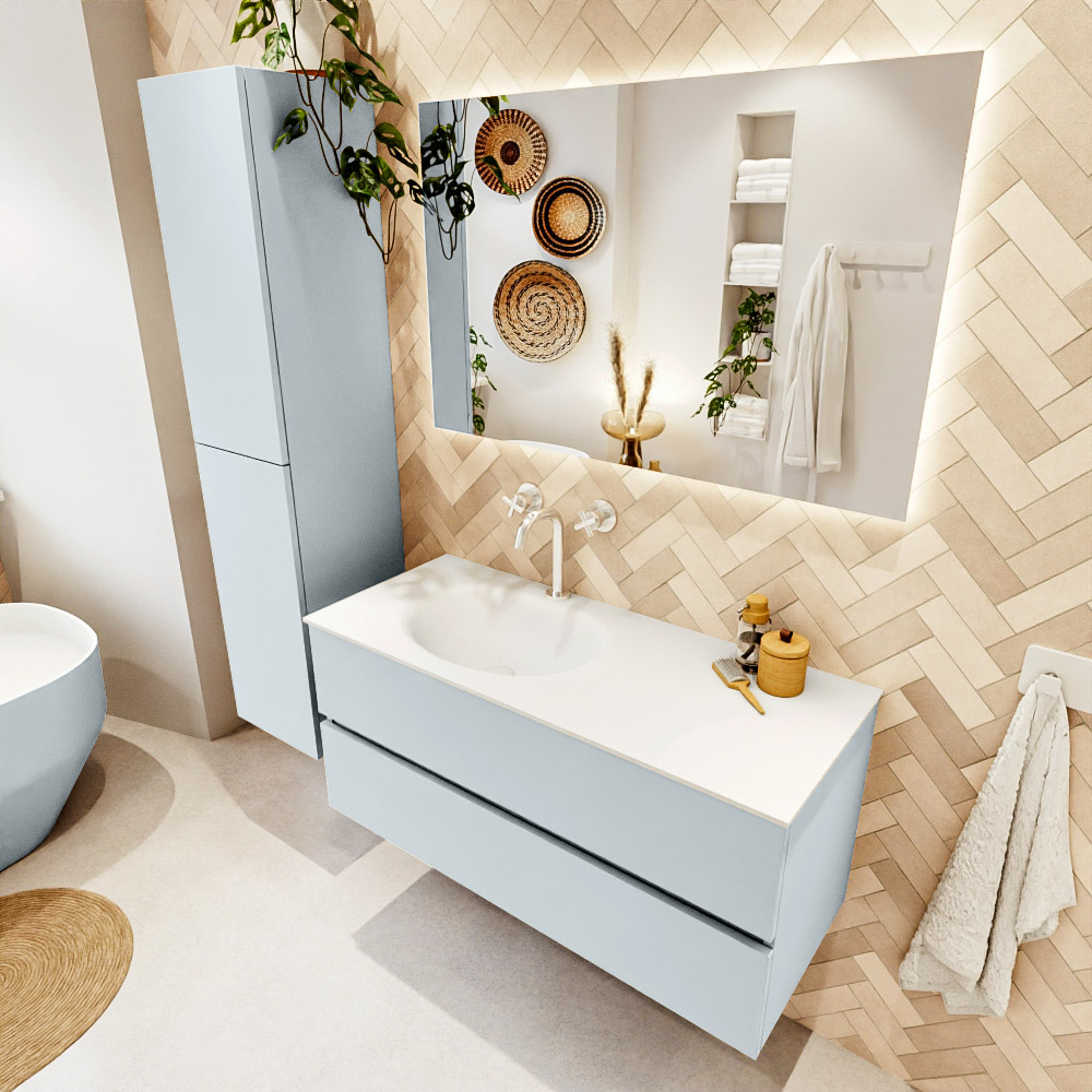 MONDIAZ VICA 150cm mueble de baño Jeans 2 cajones. Lavabo MOON Izquierda sin orificio color Talc con espejo LED.