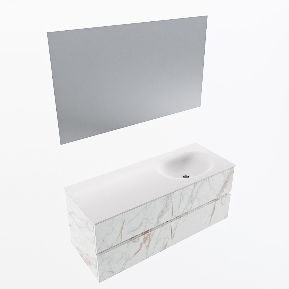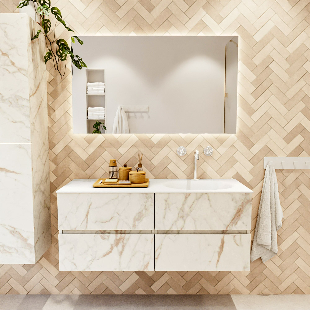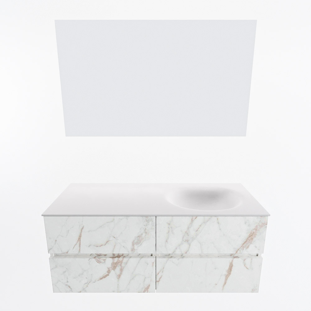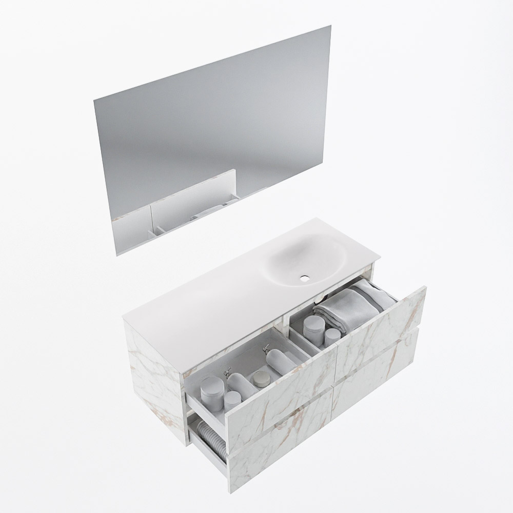 MONDIAZ VICA 120cm mueble de baño Carrara 4 cajones. Lavabo MOON Derecho 1 orificio color Talc con espejo LED.