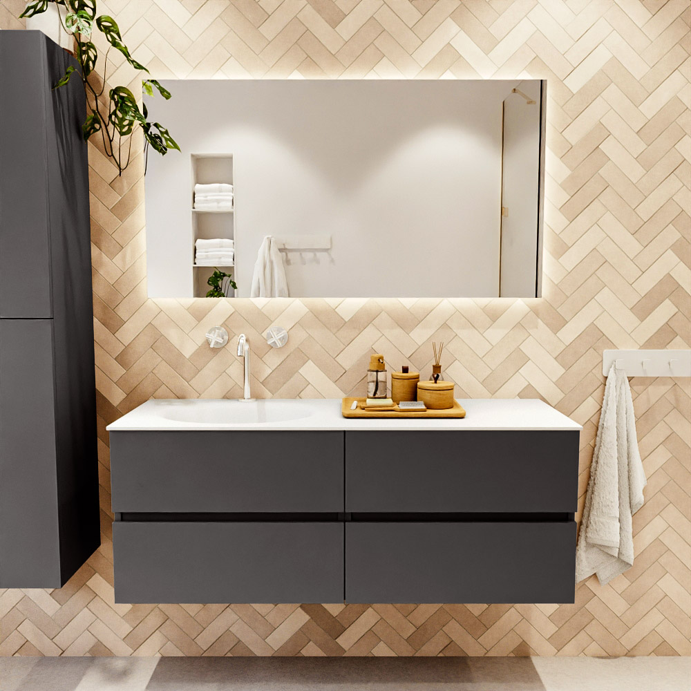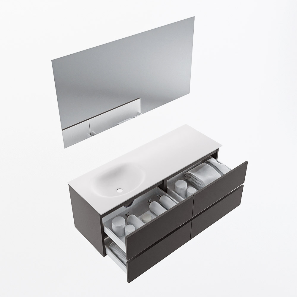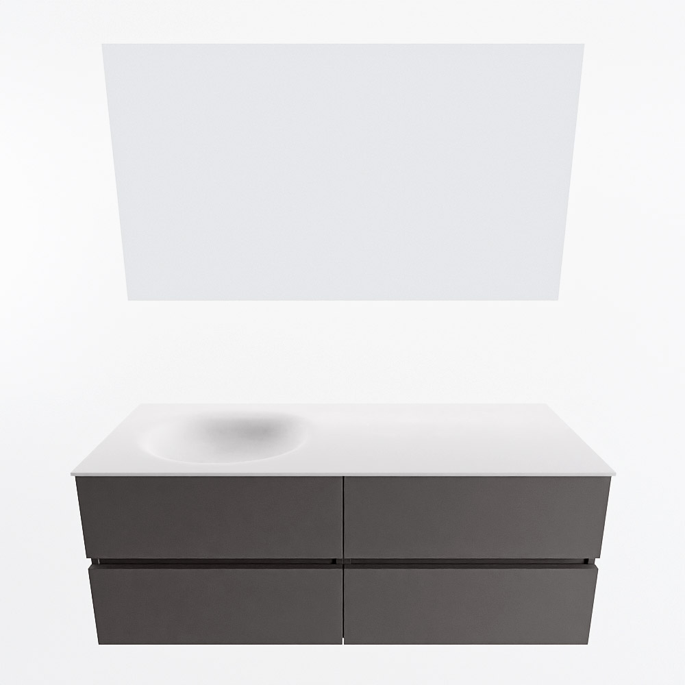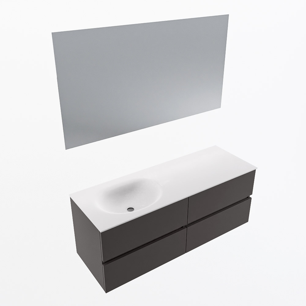 MONDIAZ VICA 130cm mueble de baño Dark Grey 4 cajones. Lavabo MOON Izquierda 1 orificio color Talc con espejo LED.